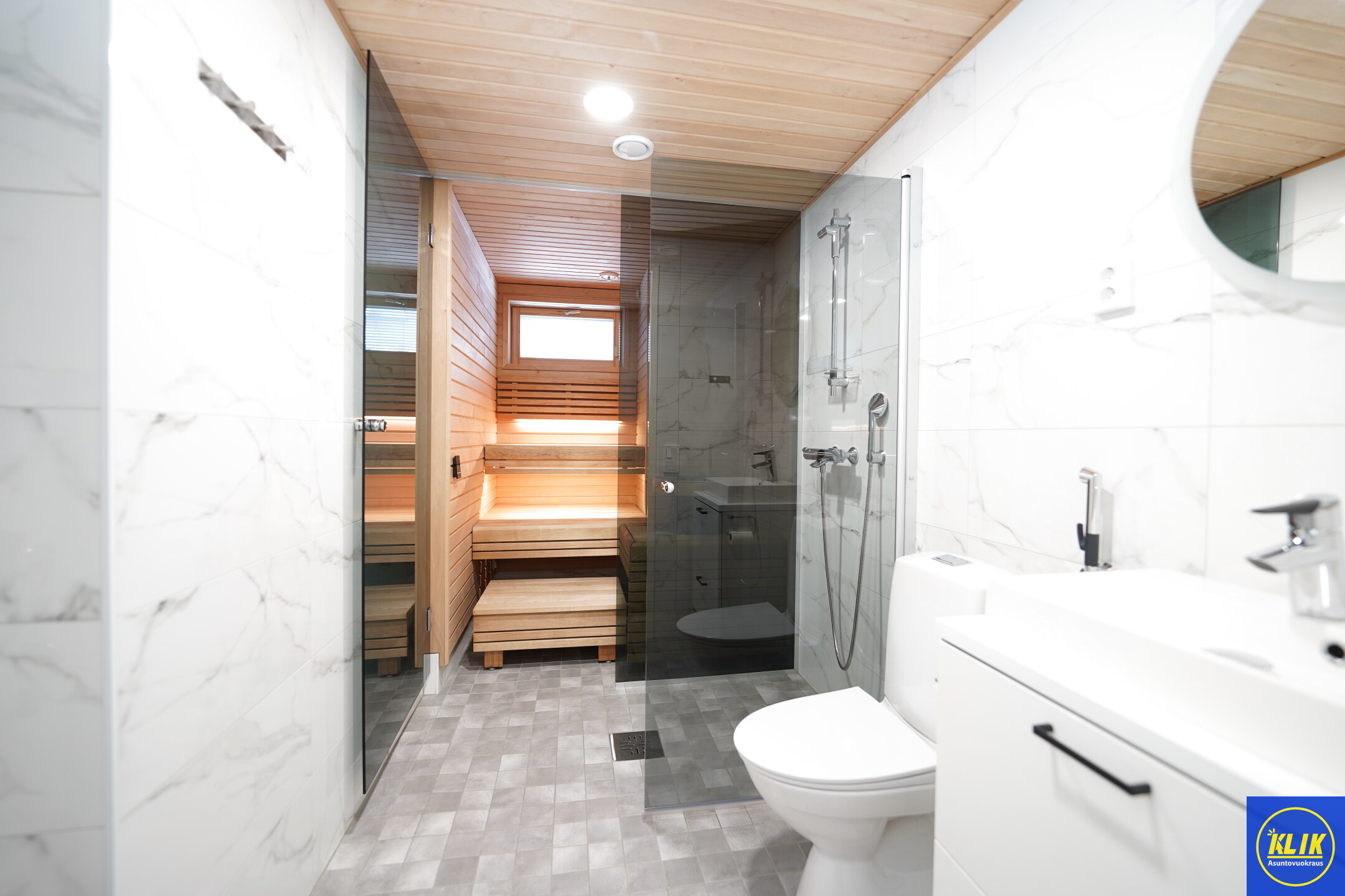 laattalattia; laattaseinä, , allaskaappi, suihku; suihkuseinä, , pesukonevalmius, kylpyhuoneessa lattialämmitys; oma sauna; kylpyhuoneessa avattava ikkuna