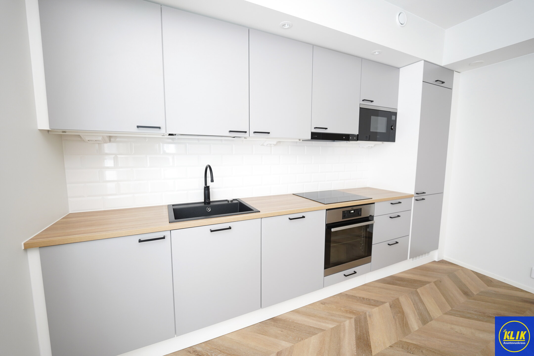 avokeittiölaminaattitasot keittiössä, keraaminen- tai induktioliesi; keittotaso ja kalusteuuni; liesituuletin, astianpesukone (60cm), jääkaappipakastin, paljon kaappitilaa; mikro valmiina keittiössä
