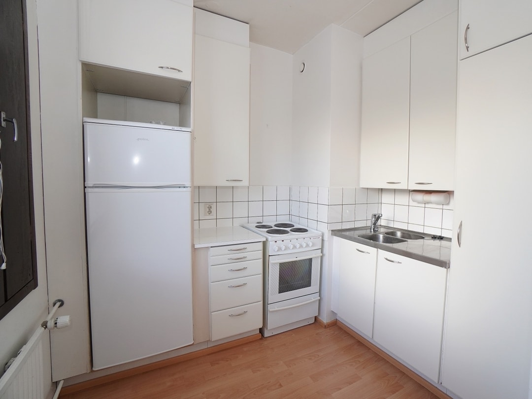 keittokomero, laminaattitasot keittiössä, sähköliesi, jääkaappipakastin
