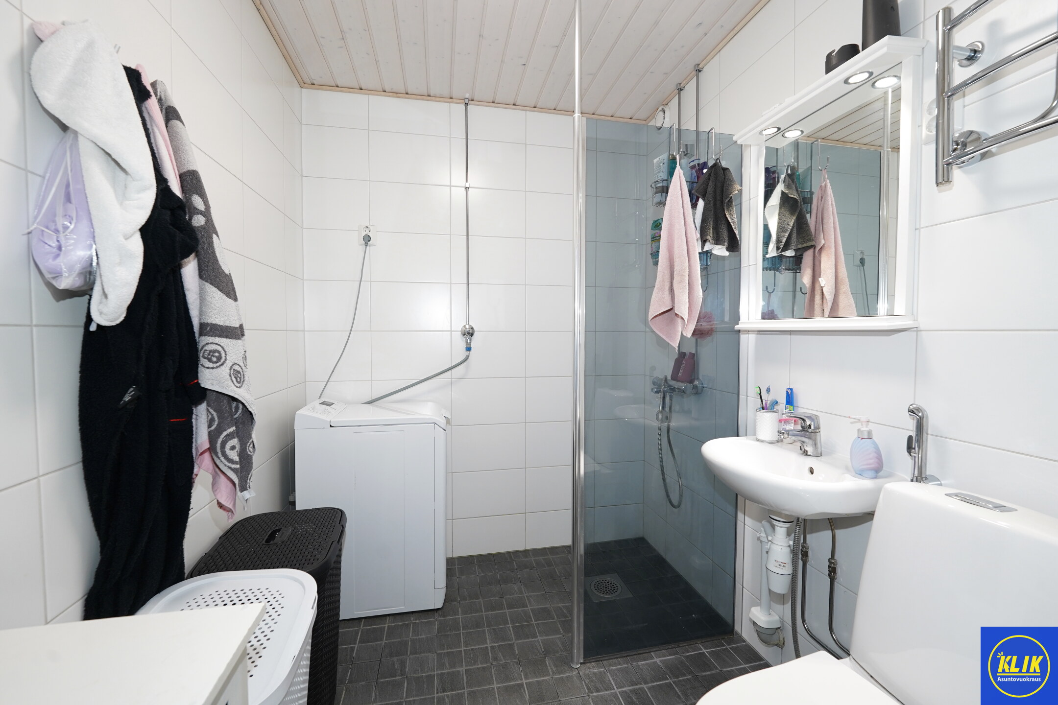 laattalattia; laattaseinä, suihku; suihkuseinä, pesukonevalmius, kylpyhuoneessa kuivauspatteri