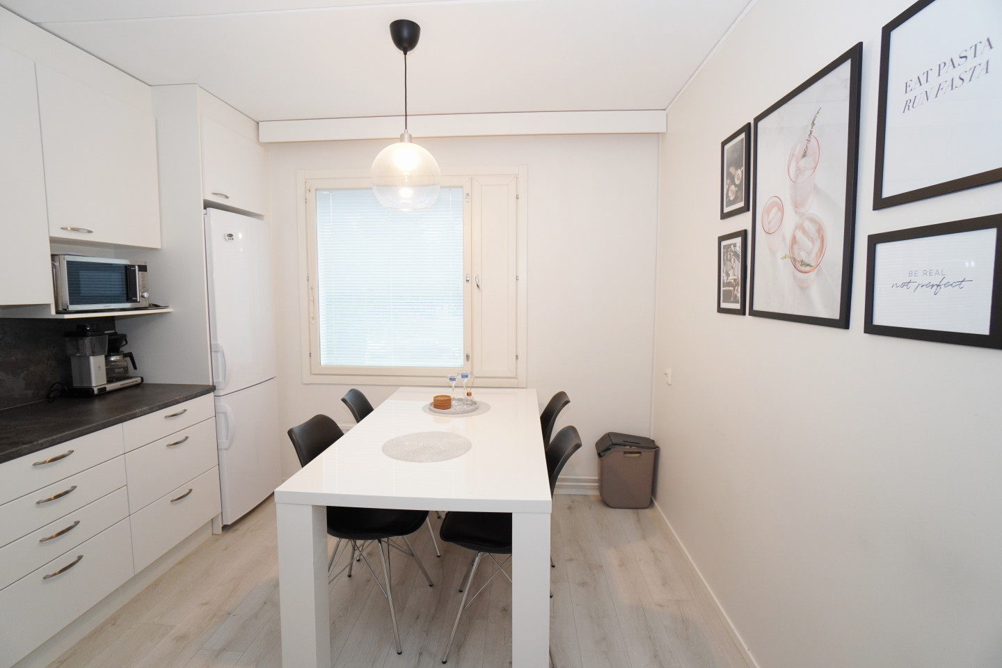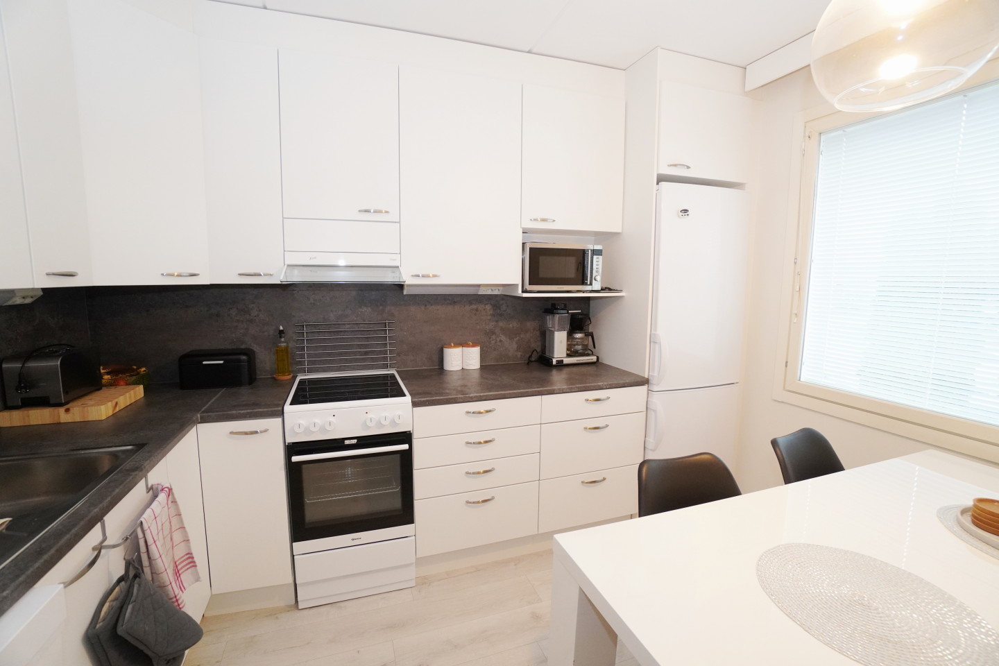 erillinen keittiölaminaattitasot keittiössä, keraaminen- tai induktioliesi; liesituuletin, astianpesukone (60cm), jääkaappipakastin, tilaa isolle ruokapöydälle; paljon kaappitilaa; paljon työskentelytilaa; mikrohylly , , , , , ,