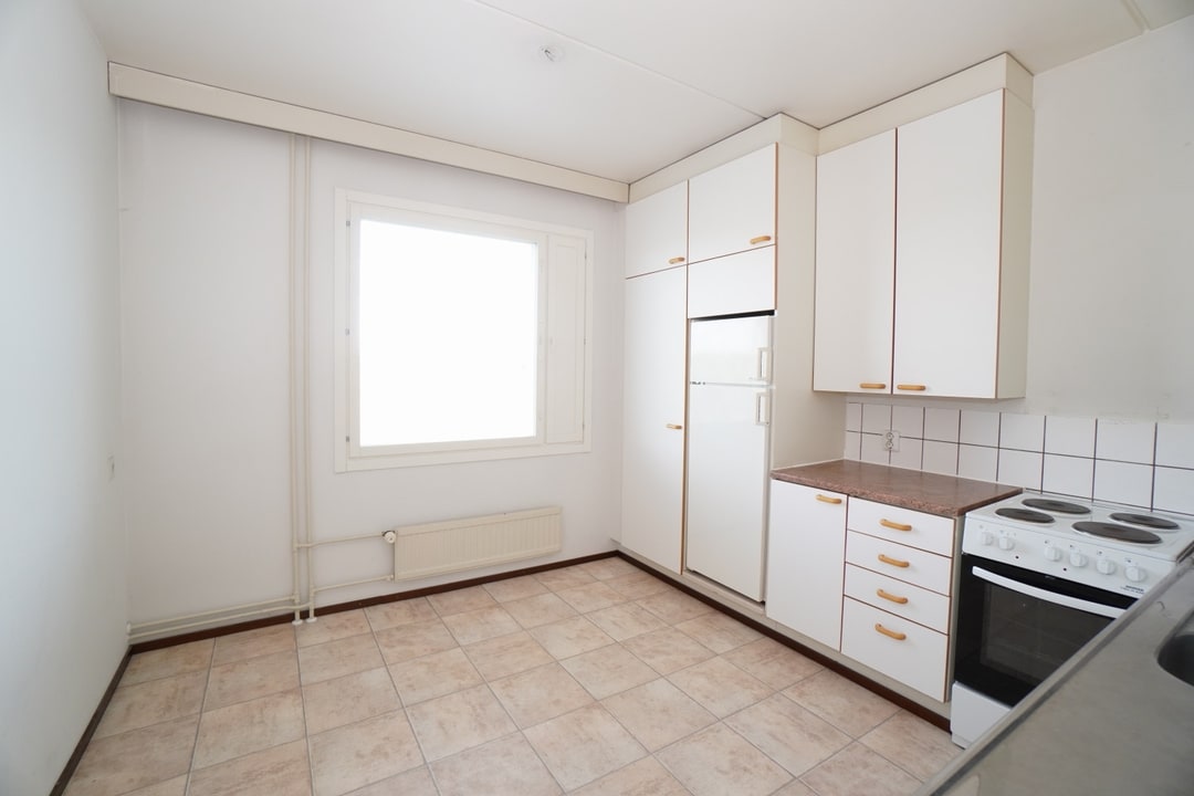 erillinen keittiö, terästasot keittiössä; laminaattitasot keittiössä, sähköliesi, , jääkaappipakastin, tilaa isolle ruokapöydälle; paljon kaappitilaa; paljon työskentelytilaa; suuri tiskipöytä
