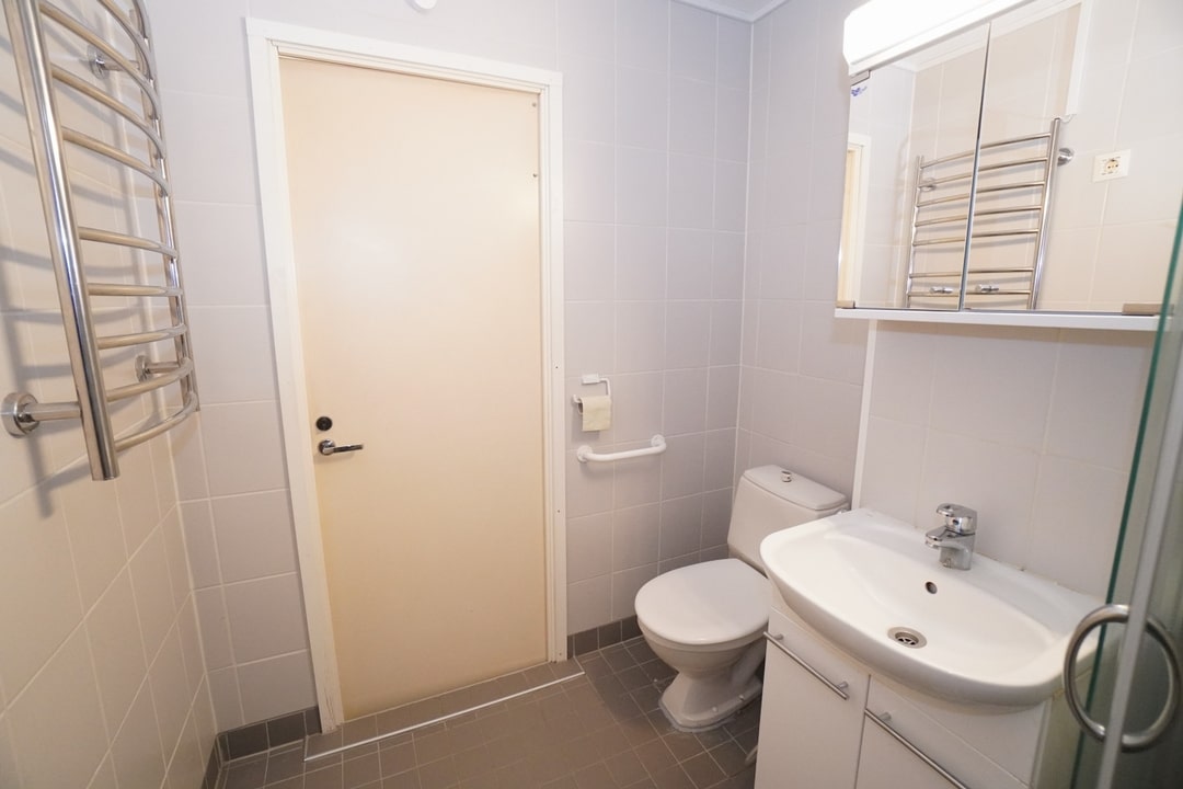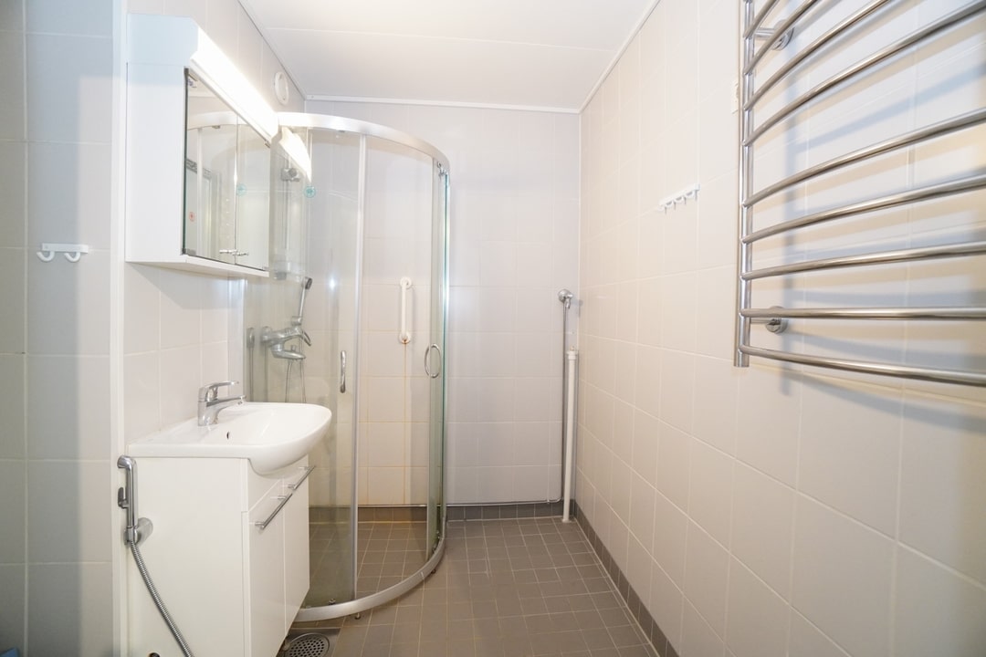 laattalattia; laattaseinä, allaskaappi; peilikaappi, suihku; suihkuseinä, pesukonevalmius, rättipatteri