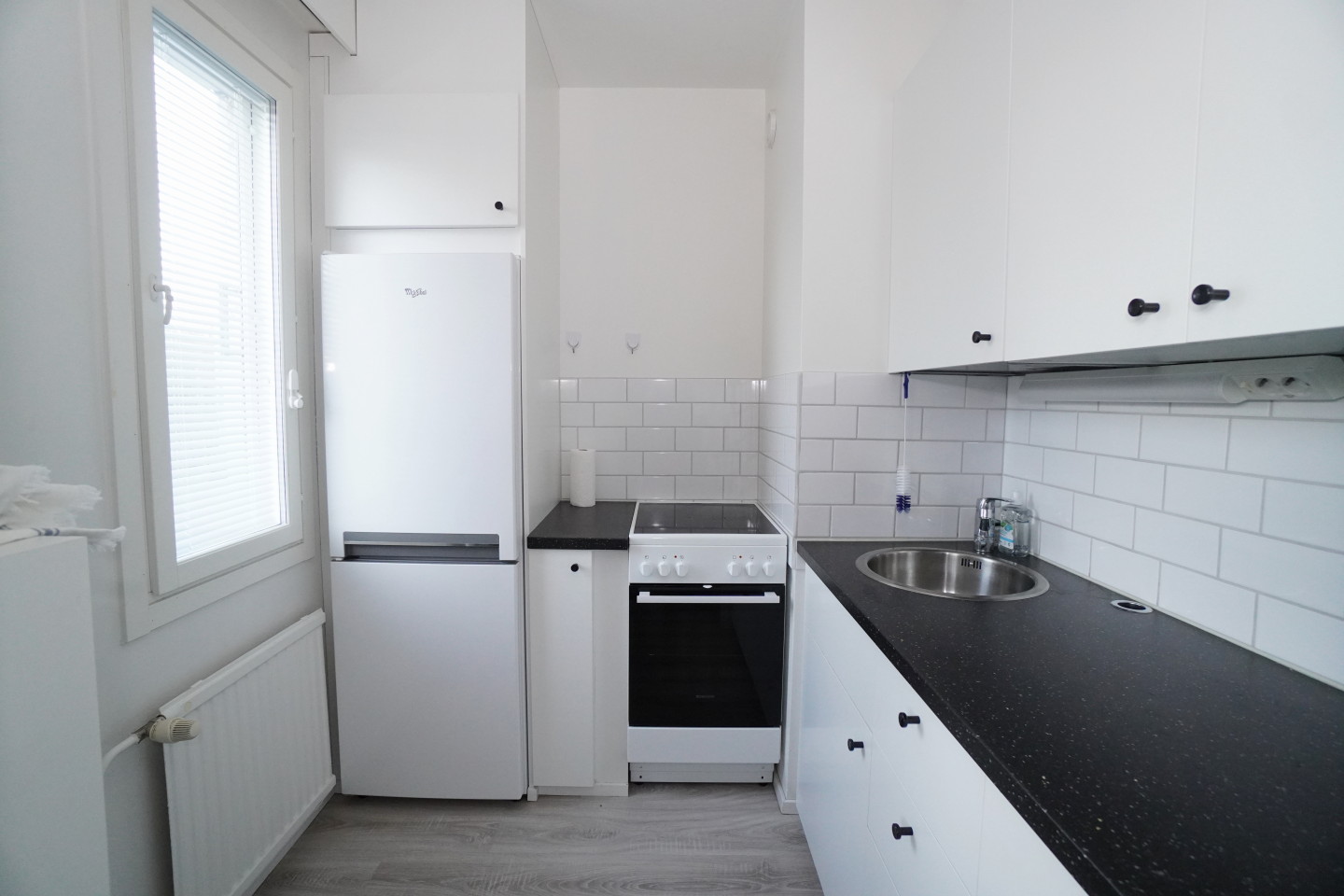 keittokomerolaminaattitasot keittiössä, sähköliesi, jääkaappipakastin
