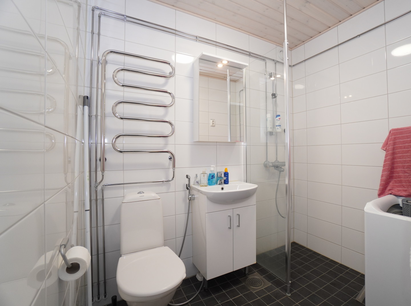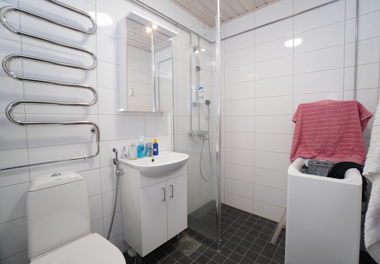 laattalattia; laattaseinä, allaskaappi; peilikaappi, suihku, pesukonevalmius, rättipatteri