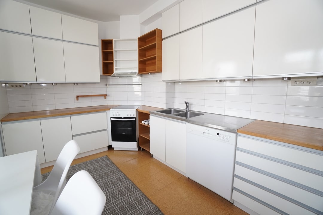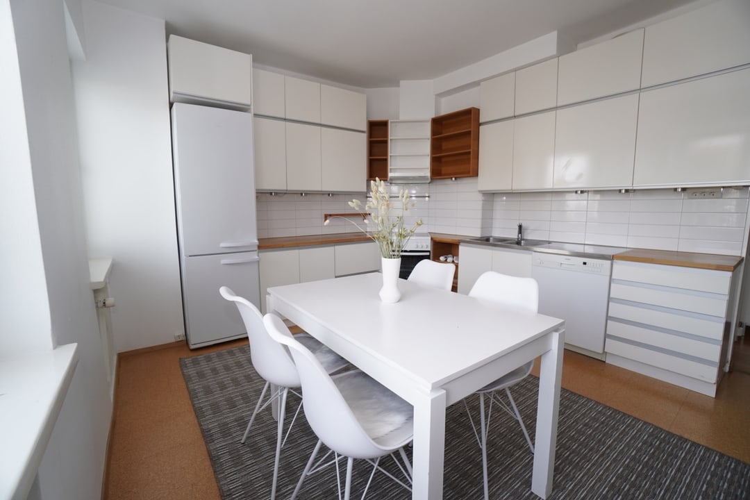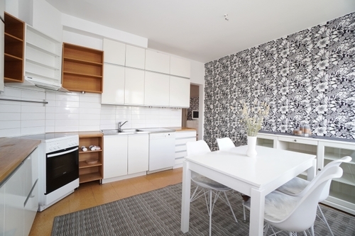 Iso saneerattu keittiö kaikilla tarvittavilla kodinkoneilla. Ruokaryhmä on valmiina keittiössä. Kaakeloidussa kylpyhuoneessa on pyykinpesukone sekä uutta vastaavat kalusteet.