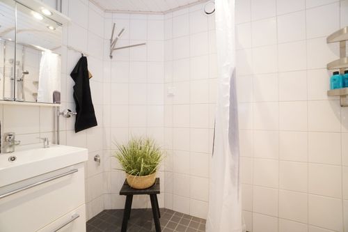 laattalattia; laattaseinä, allaskaappi; peilikaappi, suihku, pesukonevalmius, lattialämmitys