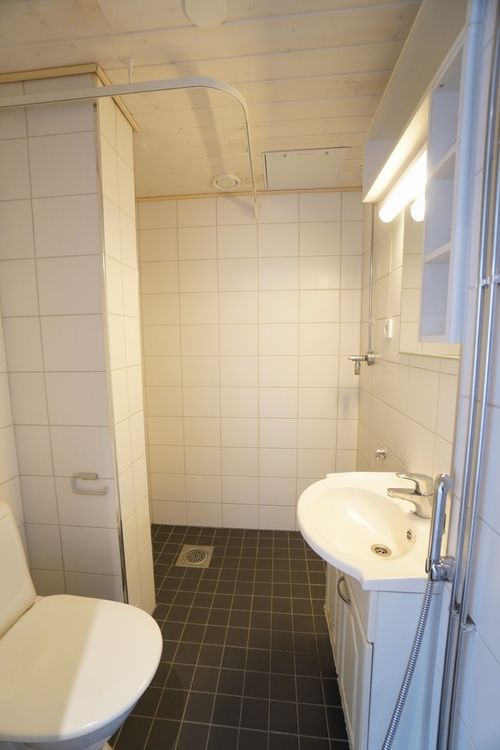 laattalattia; laattaseinä, allaskaappi; peilikaappi, suihku, pesukonevalmius, lattialämmitys