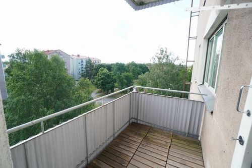 Erillisen makuuhuoneen yhteydessä on parveke. Kesällä ja miksei myöhemmälle syksyynkin saa huoneen pysymään mukavan viileänä, kun parvekkeen oven voi jättää raolleen. Parvekkeelta on kauniit 6. kerroksen näkymät.