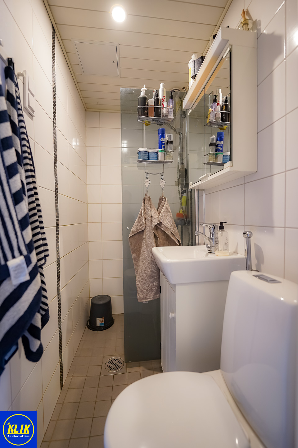 laattalattia; laattaseinä, , allaskaappi; peilikaappi, suihku; suihkuseinä, , taloyhtiössä kuivaushuone, kylpyhuoneessa lattialämmitys; taloyhtiössä sauna