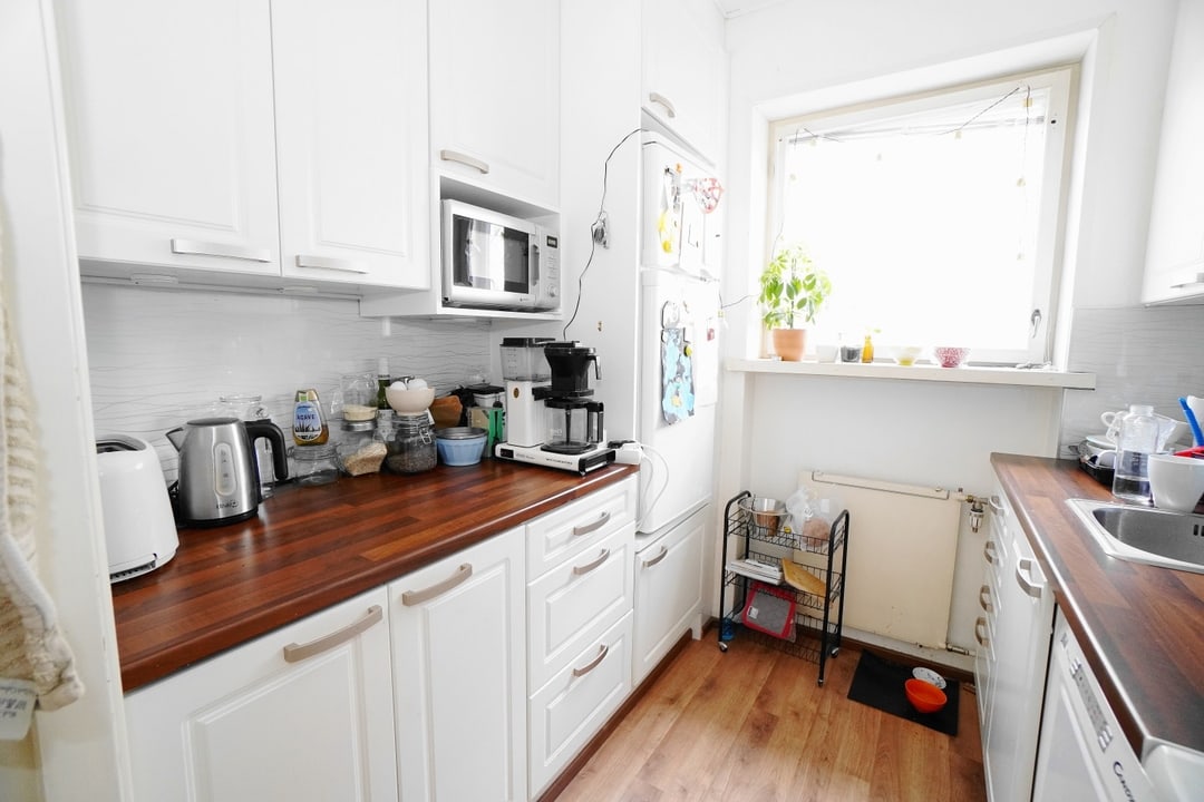 Keittiö on remontoitu hiljattain ja keittiöstä löytyy mm. astianpesukone. Makuuhuoneet ovat hyvän kokoisia ja niiden yhteydessä on kaappitilaa.