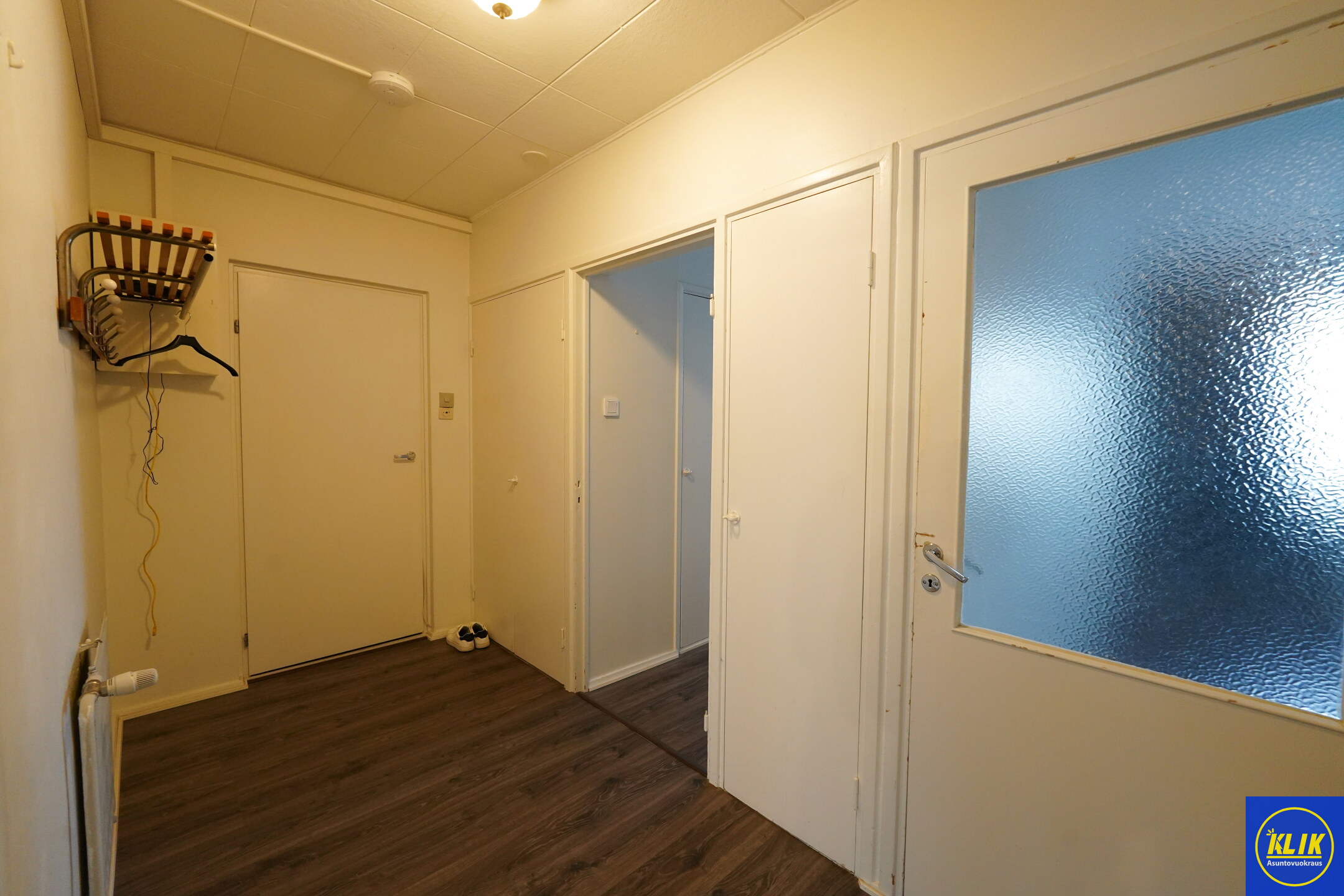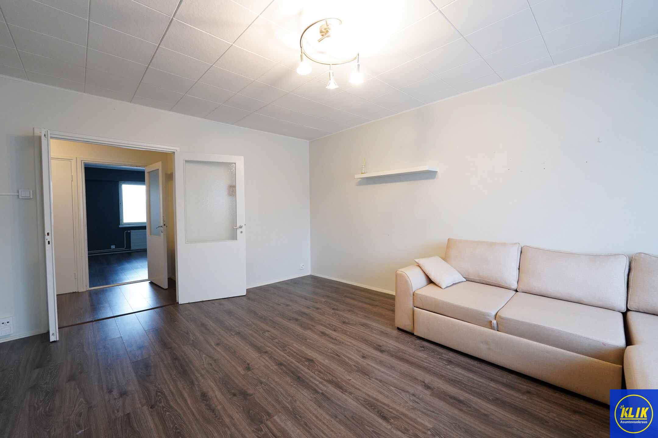 Huoneet tilavia joka mahdollistaa helpon kalustuksen. Olohuoneessa normaalia isompi oviaukko varustettuna pariovilla.