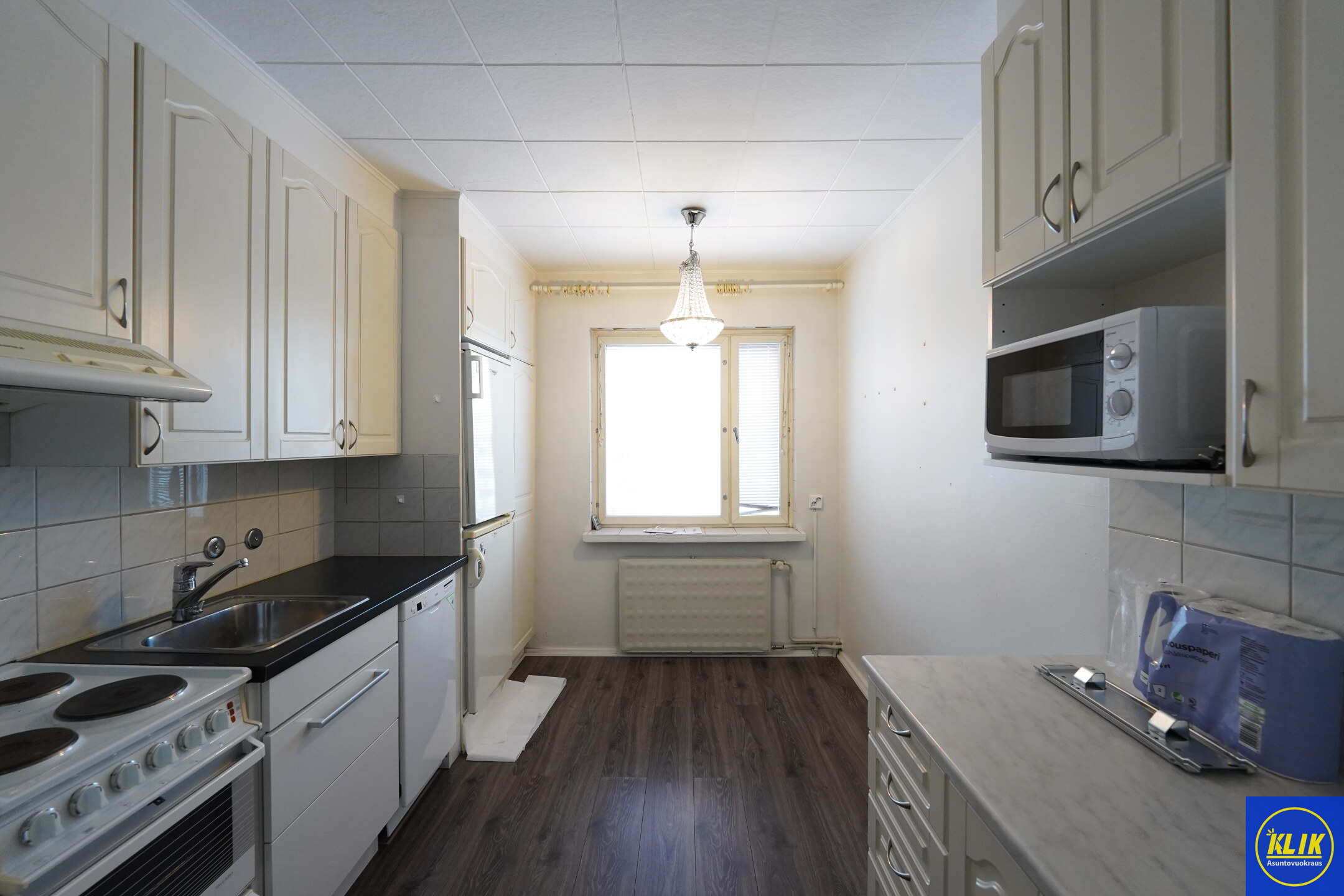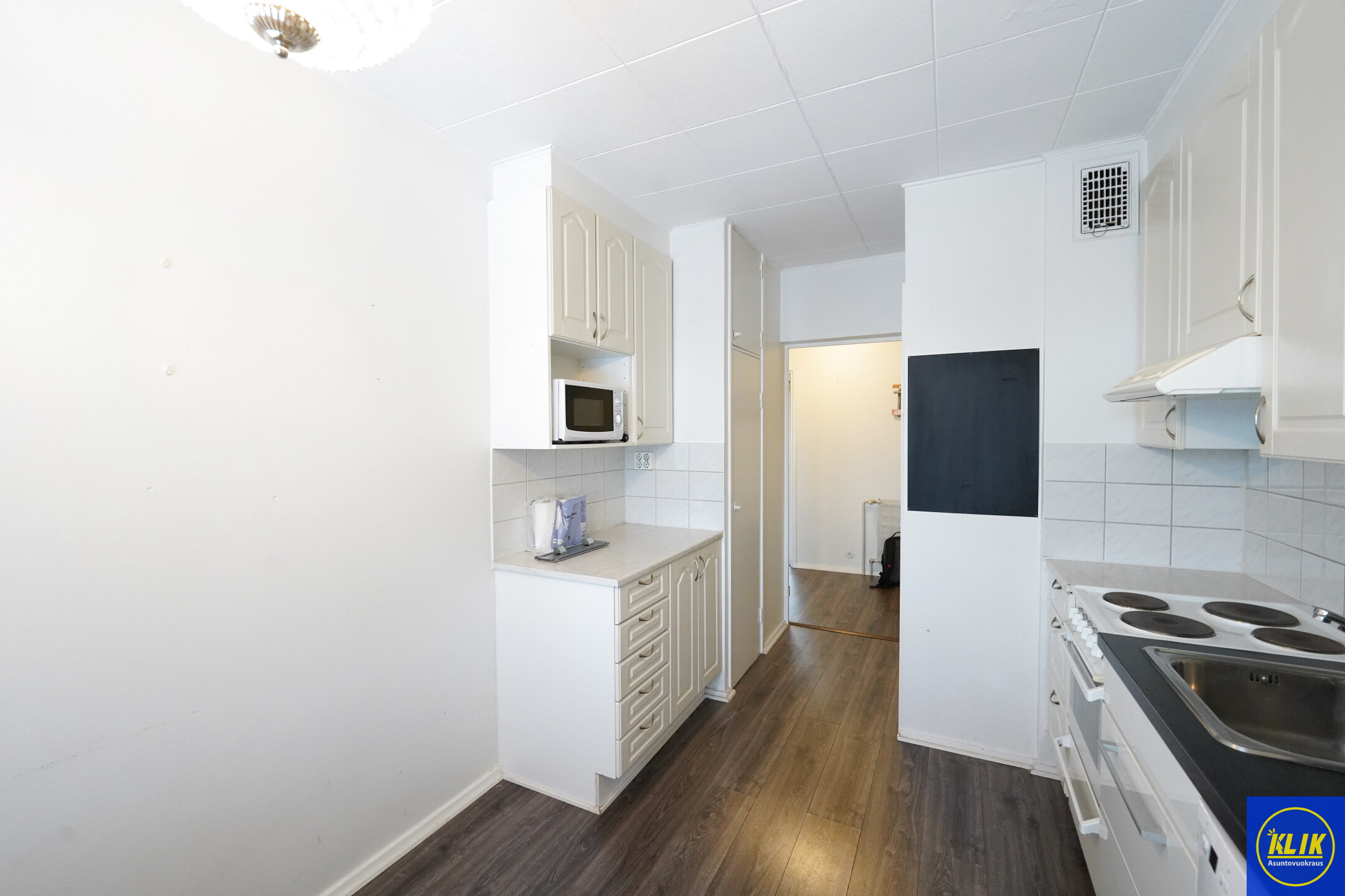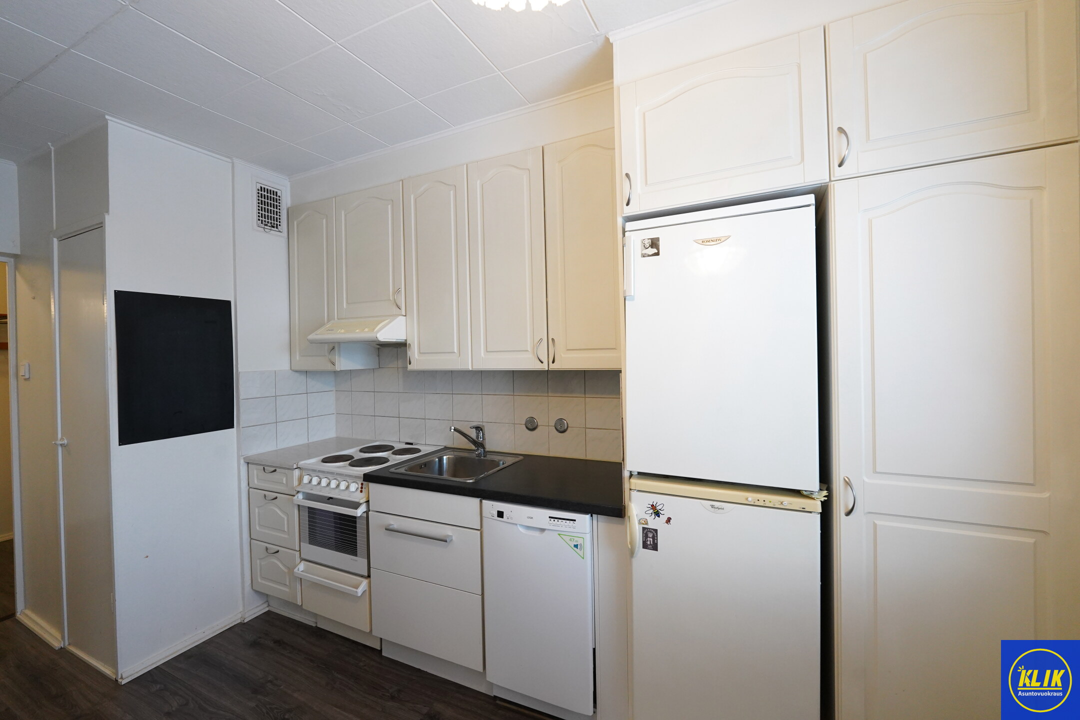 keittiölaminaattitasot keittiössä, sähköliesi; liesituuletin, astianpesukone (45cm), jääkaappi; pakastin, paljon kaappitilaa; mikrohylly