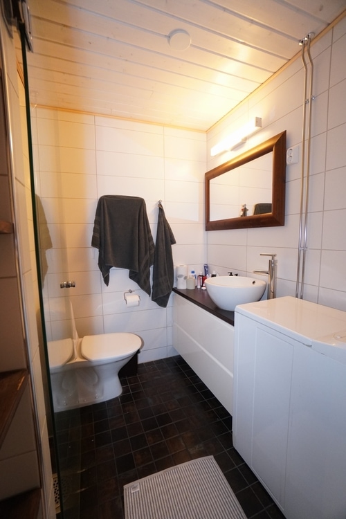 Pesuhuone uusittu kauttaaltaan putkiremontin yhteydessä muutama vuosi sitten ja pesukone on valmiina.