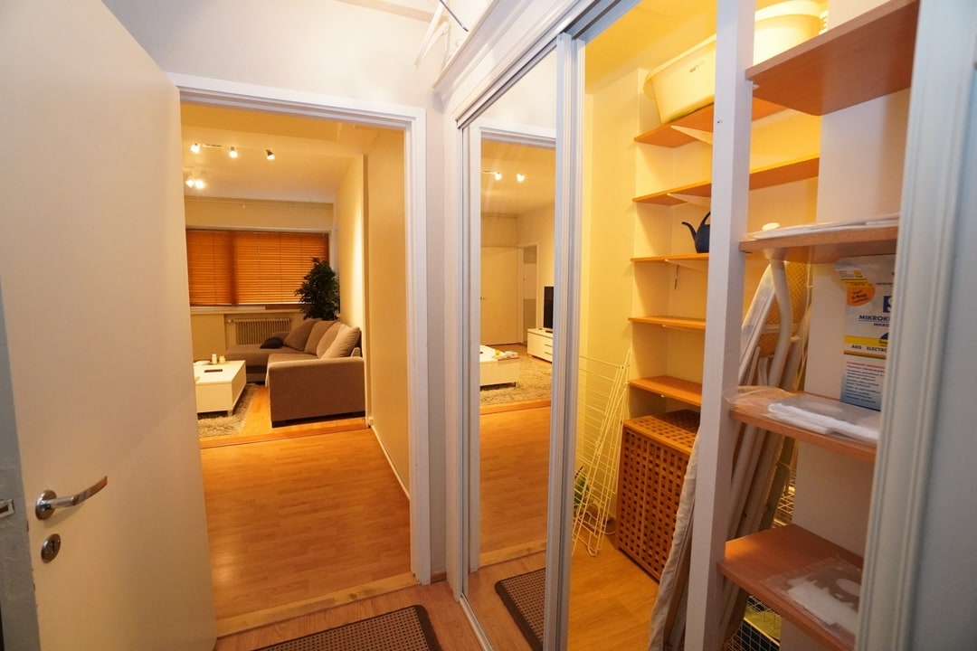 Iso vaatehuone ja peiliovikaapistot tuovat asuntoon hyvin säilytystilaa.