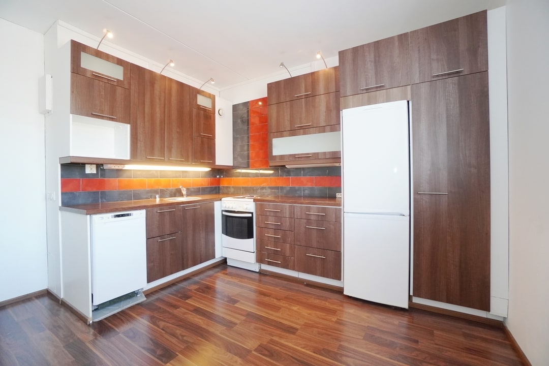 erillinen keittiö, laminaattitasot keittiössä, sähköliesi, astianpesukone (45cm), jääkaappipakastin, tilaa isolle ruokapöydälle; paljon kaappitilaa; paljon työskentelytilaa; mikrohylly