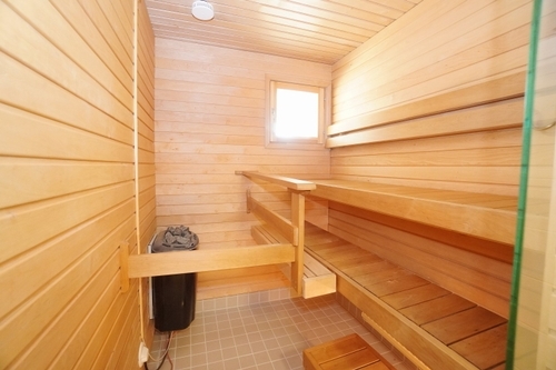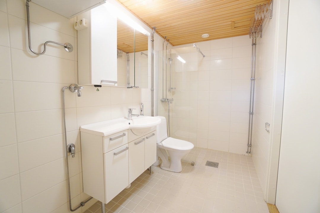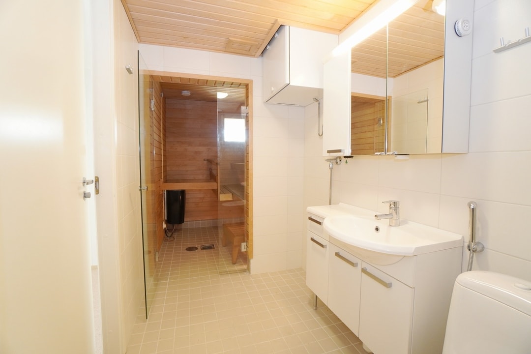 Kylpyhuone on kauttaaltaan laatoitettu ja erinomaisessa kunnossa. Pyykinpesukoneelle on hyvä paikka ja oma sauna kruunaa kokonaisuuden.