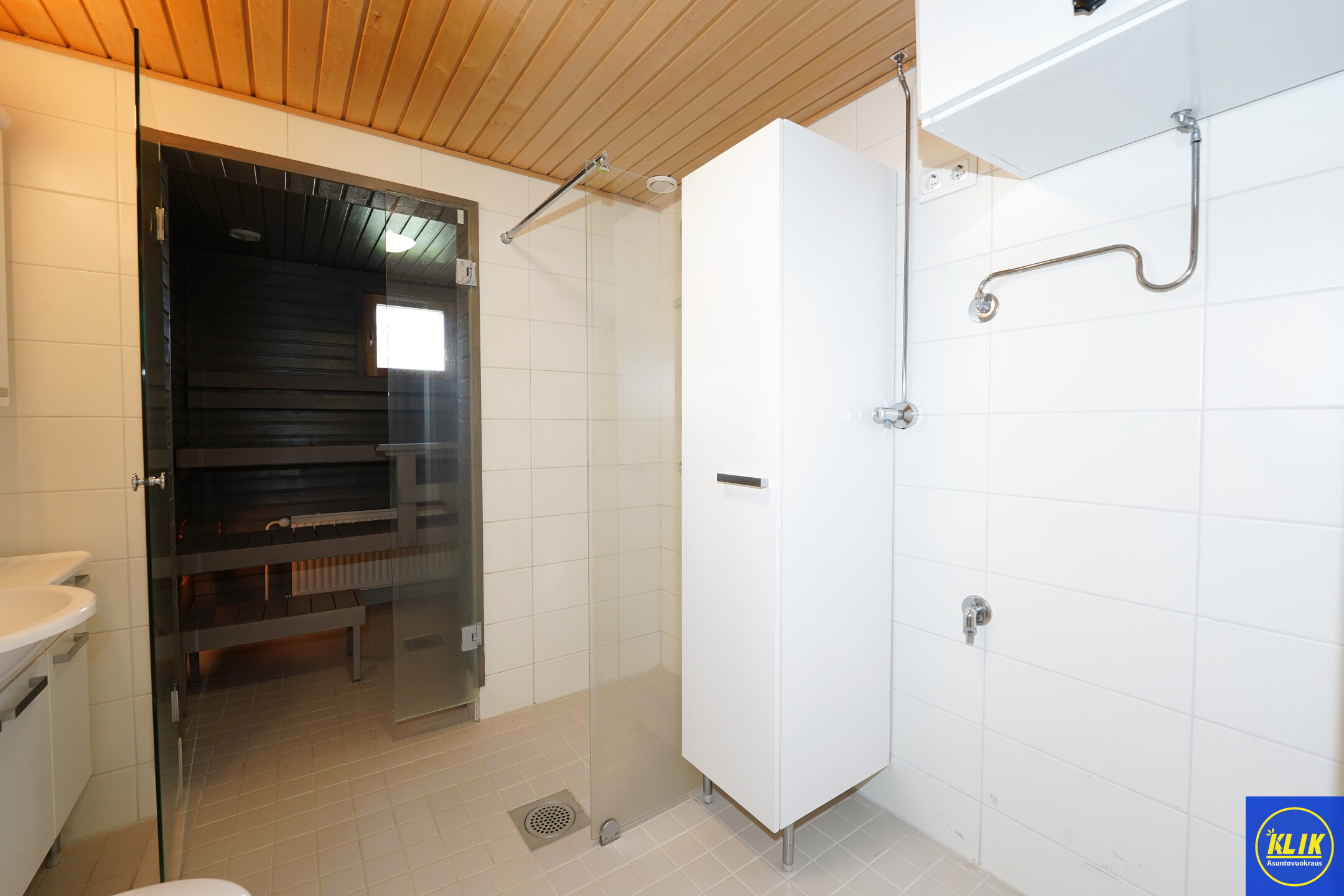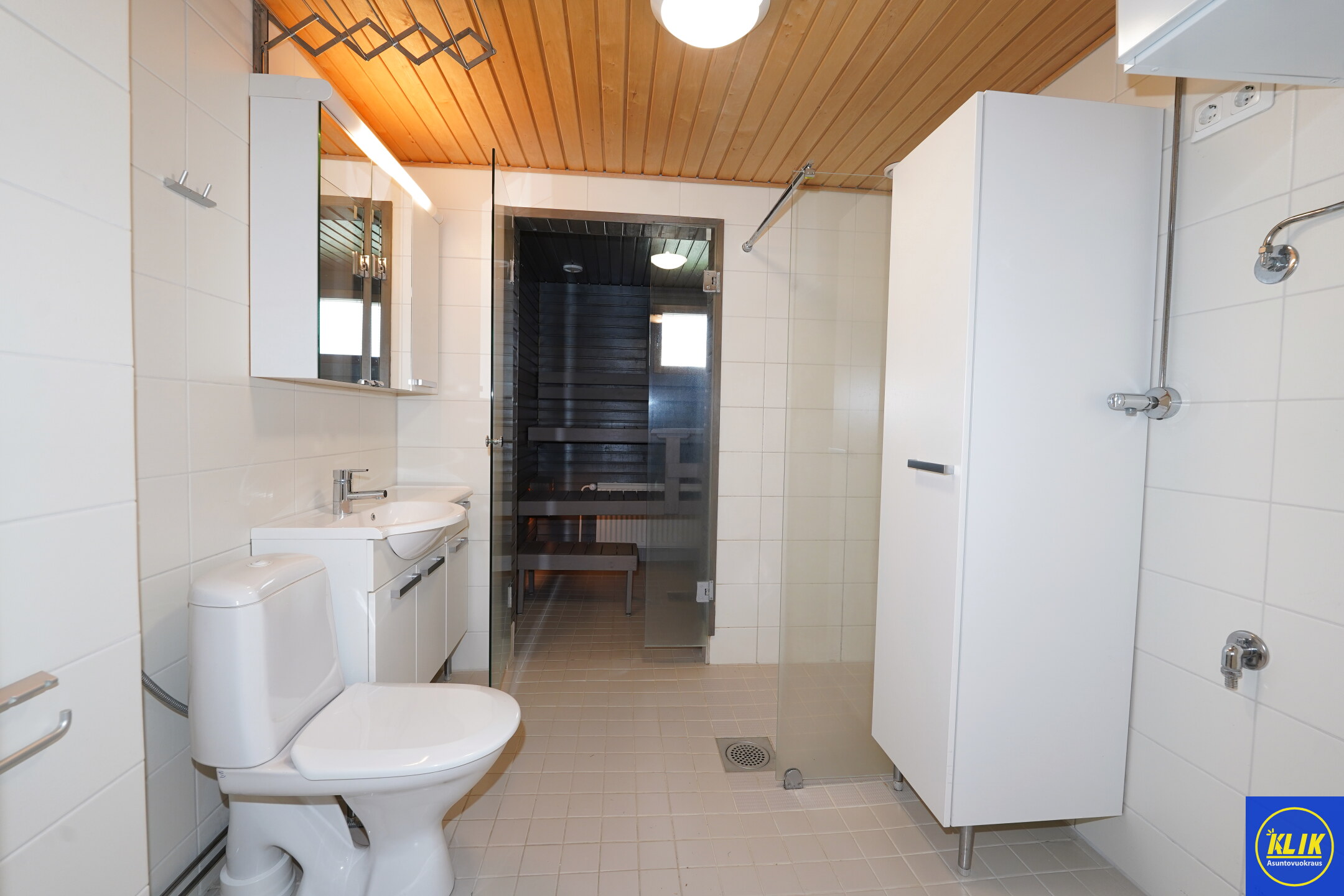 laattalattia; laattaseinä, asunnossa kaksi WC:tä, allaskaappi; peilikaappi; muuta säilytystilaa WC:ssä, suihku; suihkuseinä, , pesukonevalmius, kylpyhuoneessa lattialämmitys; oma sauna; kylpyhuoneessa avattava ikkuna