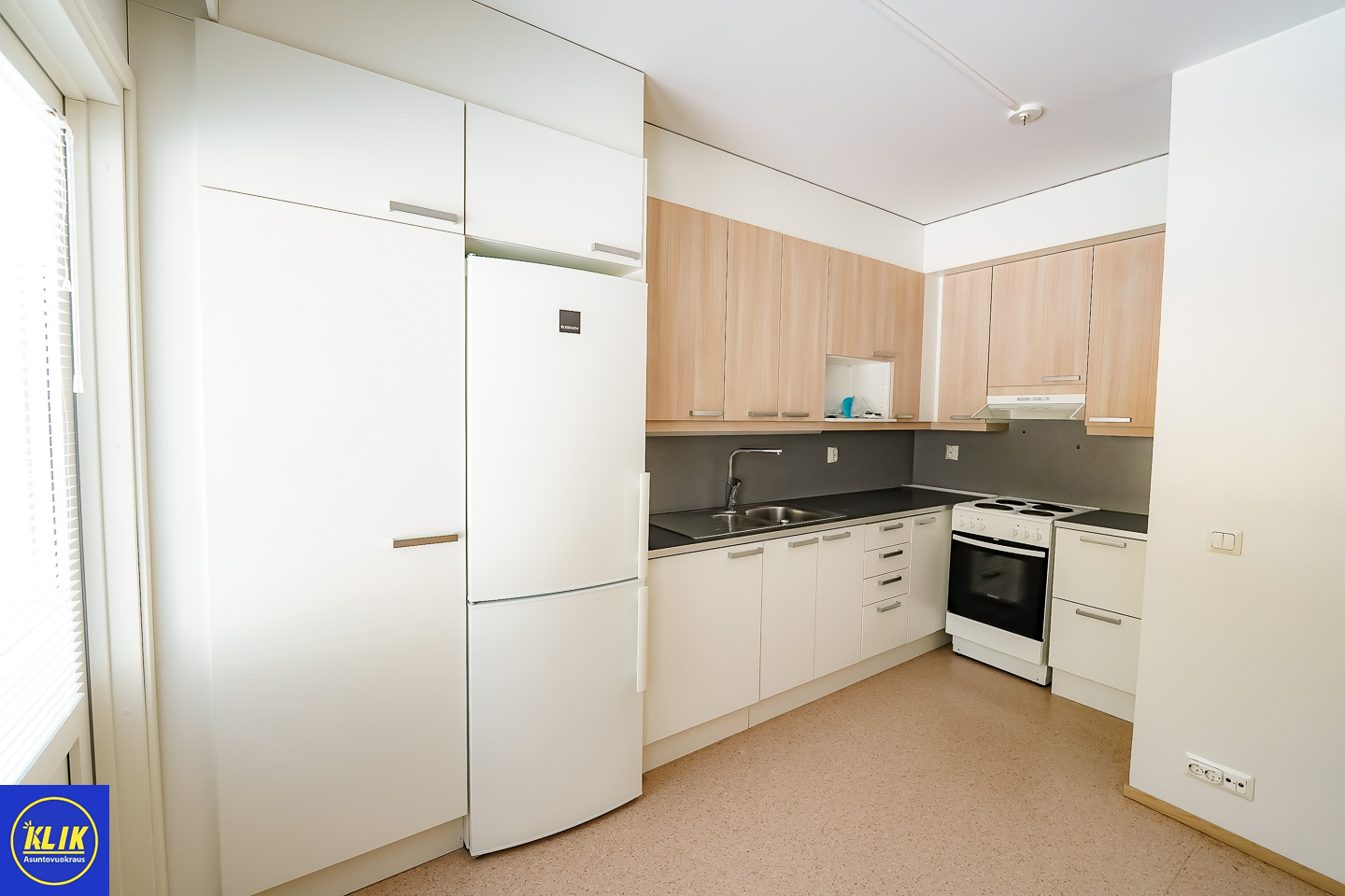 erillinen keittiölaminaattitasot keittiössä, sähköliesi; liesituuletin, pesukoneliitos, jääkaappipakastin, tilaa isolle ruokapöydälle; paljon kaappitilaa; mikrohylly