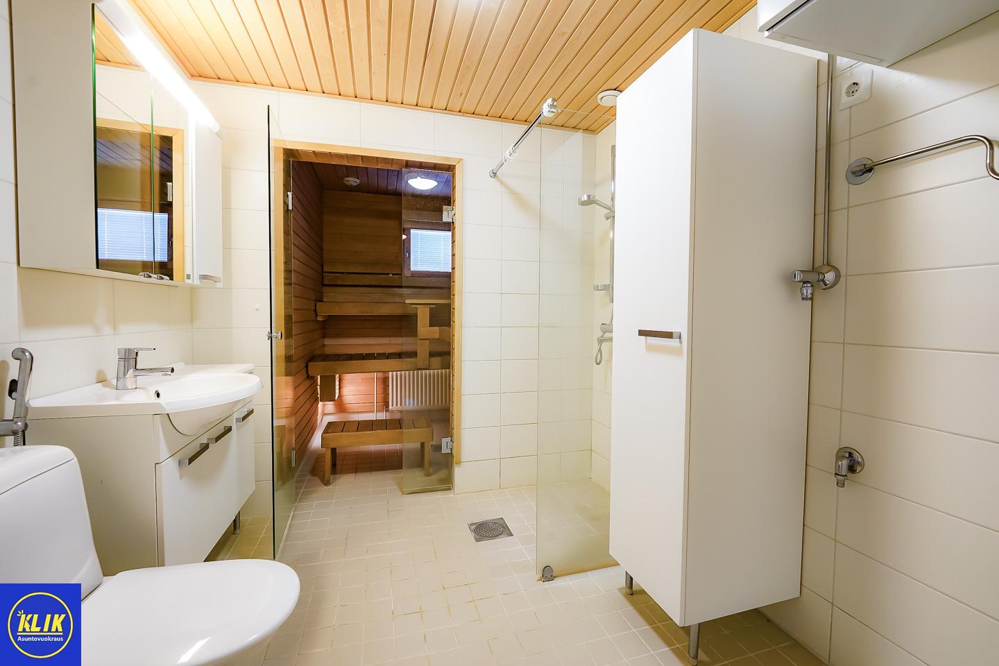 laattalattia; laattaseinä, myös erillinen WC, allaskaappi; peilikaappi; muuta säilytystilaa WC:ssä, suihku; suihkuseinä, pesukonevalmius, lattialämmitys; sauna; avattava ikkuna