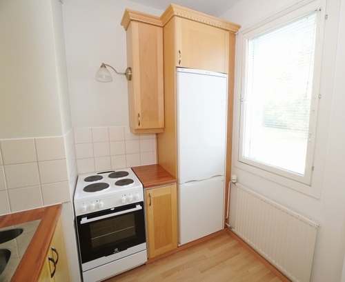 keittokomero, laminaattitasot keittiössä, sähköliesi, jääkaappipakastin, mikro valmiina keittiössä; mikrohylly
