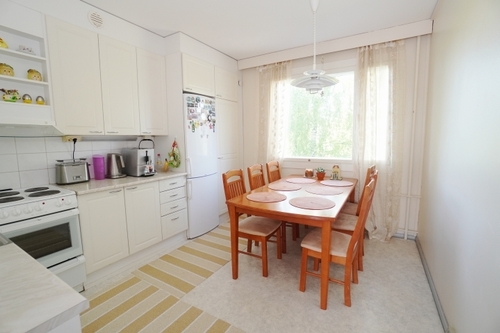 erillinen keittiö, laminaattitasot keittiössä, sähköliesi; liesituuletin, pesukoneliitos, jääkaappipakastin, tilaa isolle ruokapöydälle; paljon kaappitilaa; paljon työskentelytilaa; suuri tiskipöytä