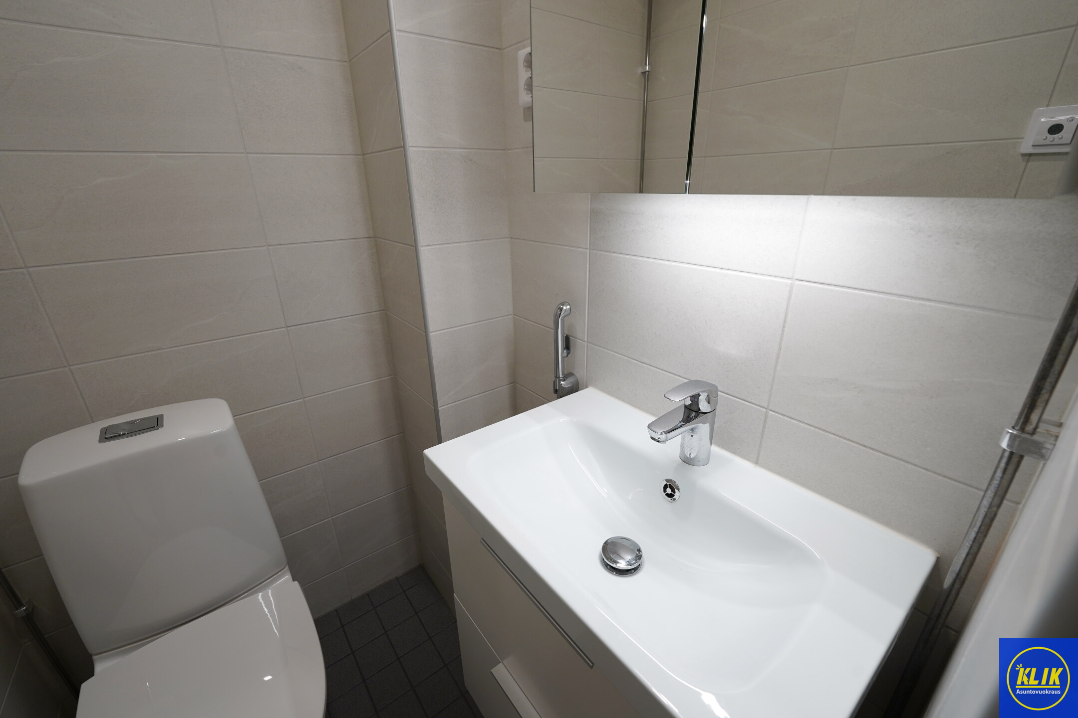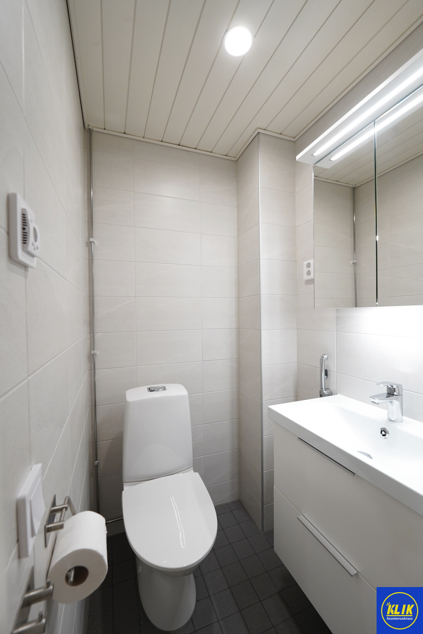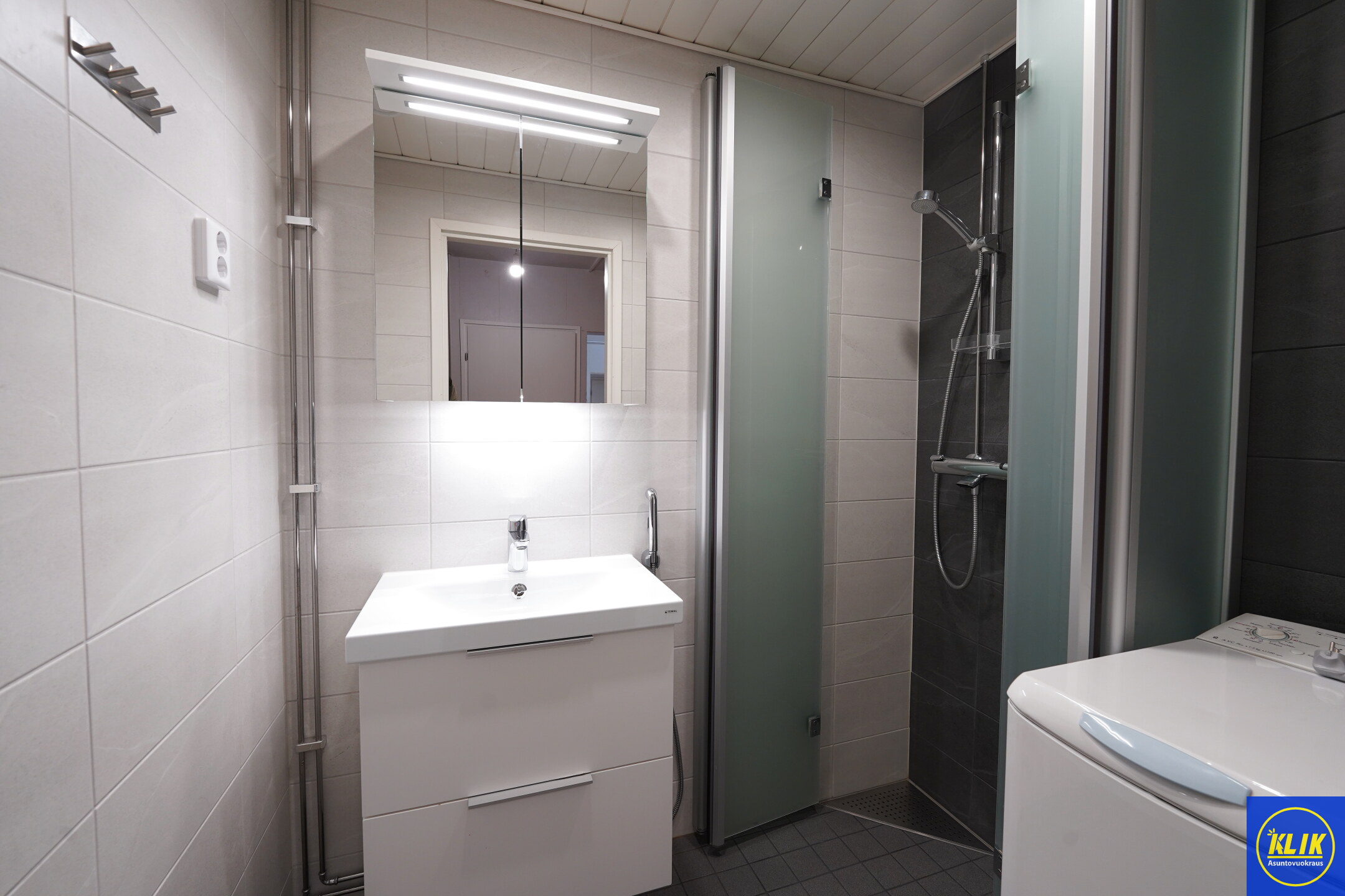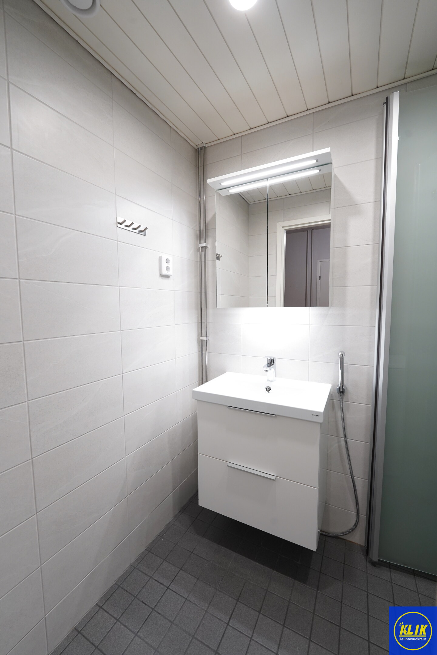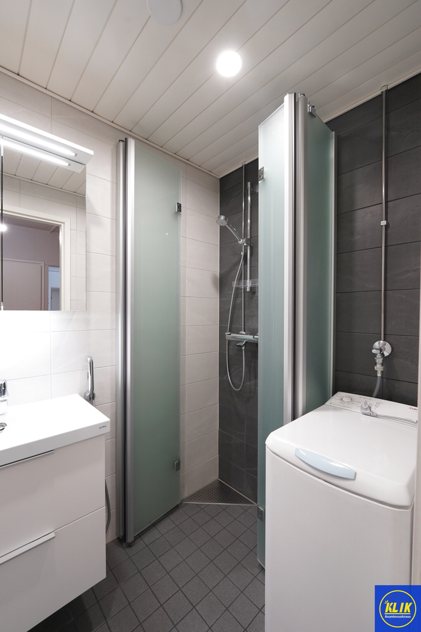 laattalattia; laattaseinä, allaskaappi; peilikaappi, suihku; suihkuseinä, pesukonevalmius, kylpyhuoneessa lattialämmitys