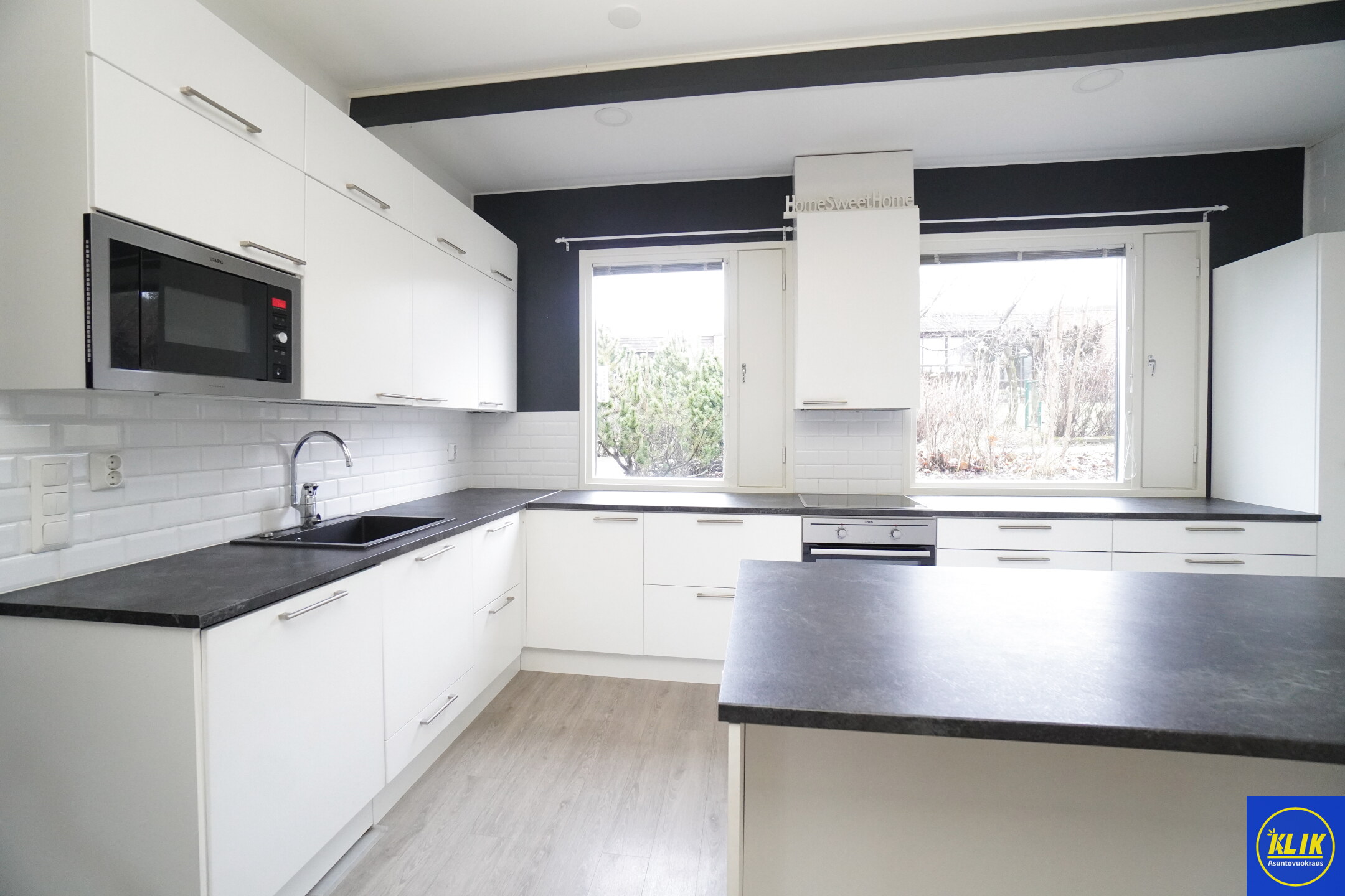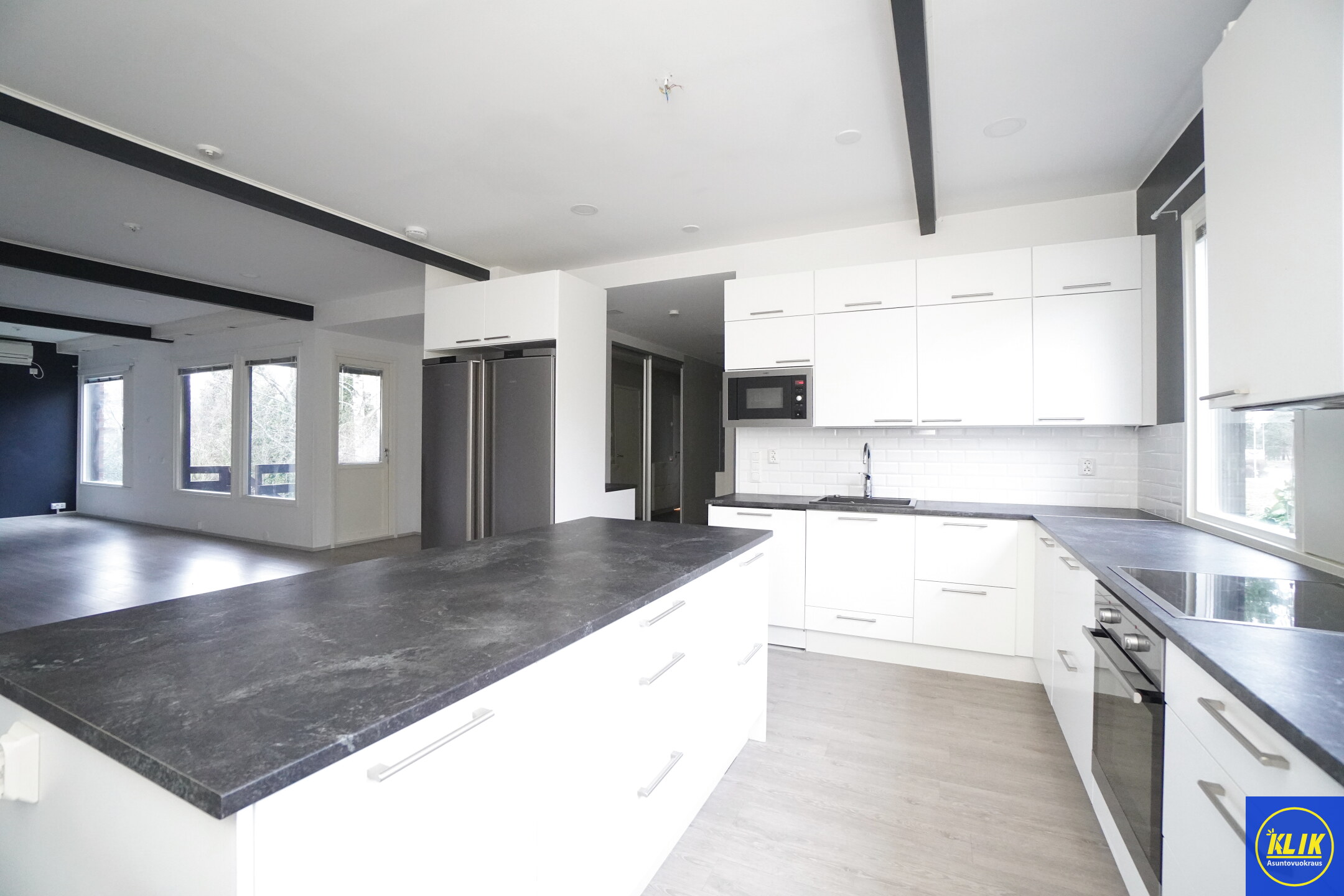 avokeittiölaminaattitasot keittiössä, keraaminen- tai induktioliesi; keittotaso ja kalusteuuni; liesituuletin, astianpesukone (60cm), jääkaappi; pakastin, paljon kaappitilaa; paljon työskentelytilaa; mikro valmiina keittiössä