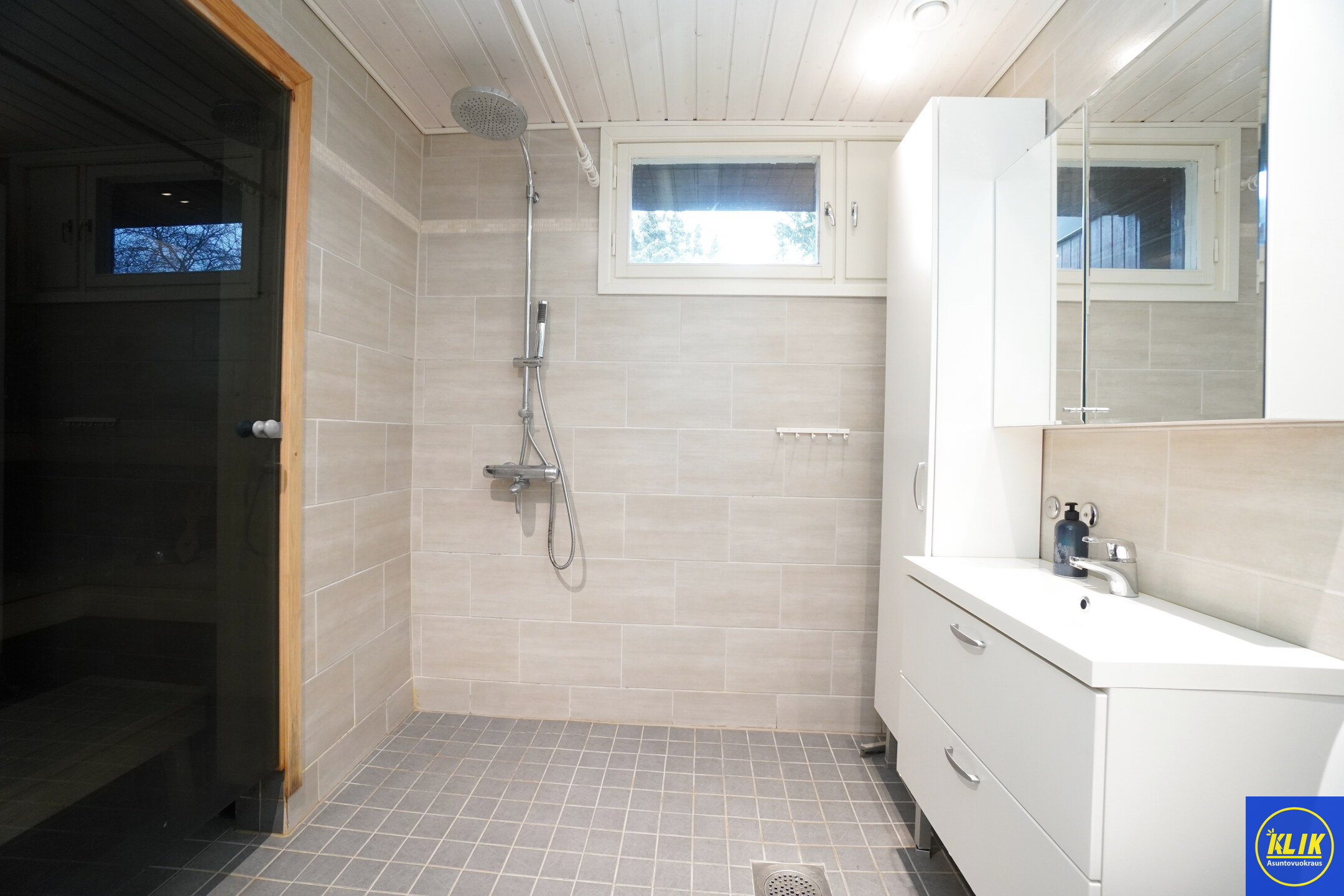 laattalattia; laattaseinä, , allaskaappi; peilikaappi, suihku, , pesukonevalmius, kylpyhuoneessa lattialämmitys; oma sauna; kylpyhuoneessa avattava ikkuna; kodinhoitohuone
