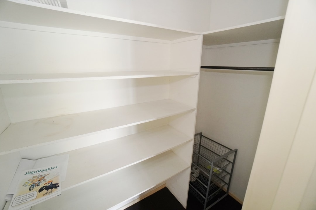 Makuuhuoneeseen mahtuu suurempikin sänky. Säilytystilaa löytyy niin makuuhuoneen puolelta kaappien muodossa kuin vaatehuoneenakin.