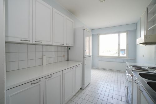 erillinen keittiö, terästasot keittiössä; laminaattitasot keittiössä, sähköliesi; liesituuletin, astianpesukone (45cm), jääkaappipakastin, tilaa isolle ruokapöydälle; paljon kaappitilaa; paljon työskentelytilaa; suuri tiskipöytä
