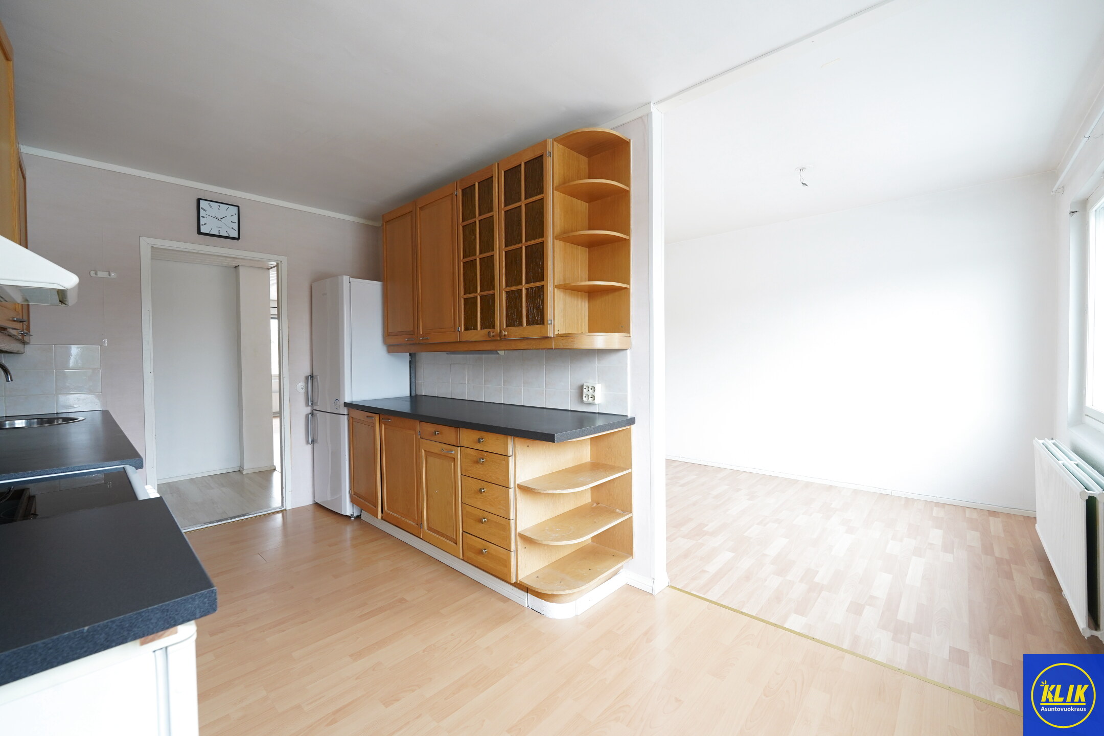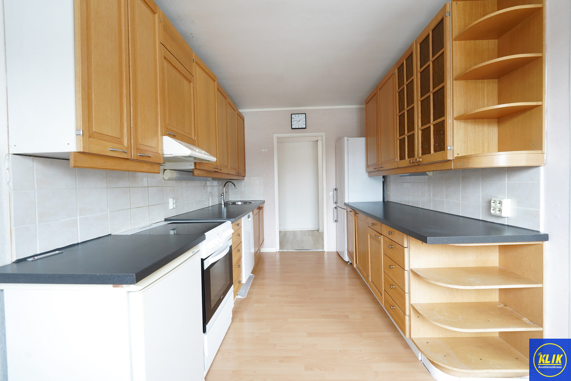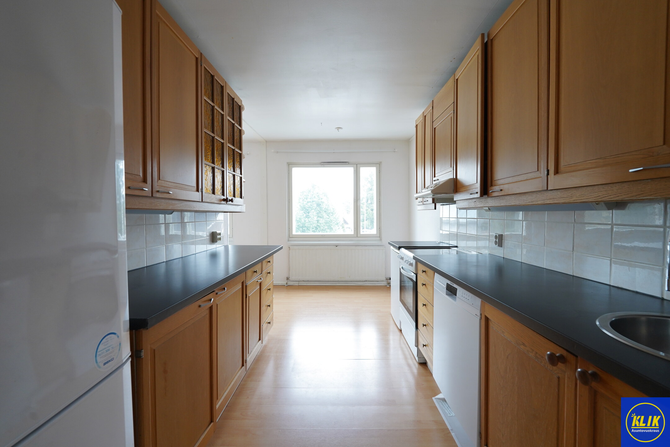 erillinen keittiölaminaattitasot keittiössä, keraaminen- tai induktioliesi; liesituuletin, astianpesukone (60cm), jääkaappi; jääkaappipakastin, tilaa isolle ruokapöydälle; paljon kaappitilaa; paljon työskentelytilaa