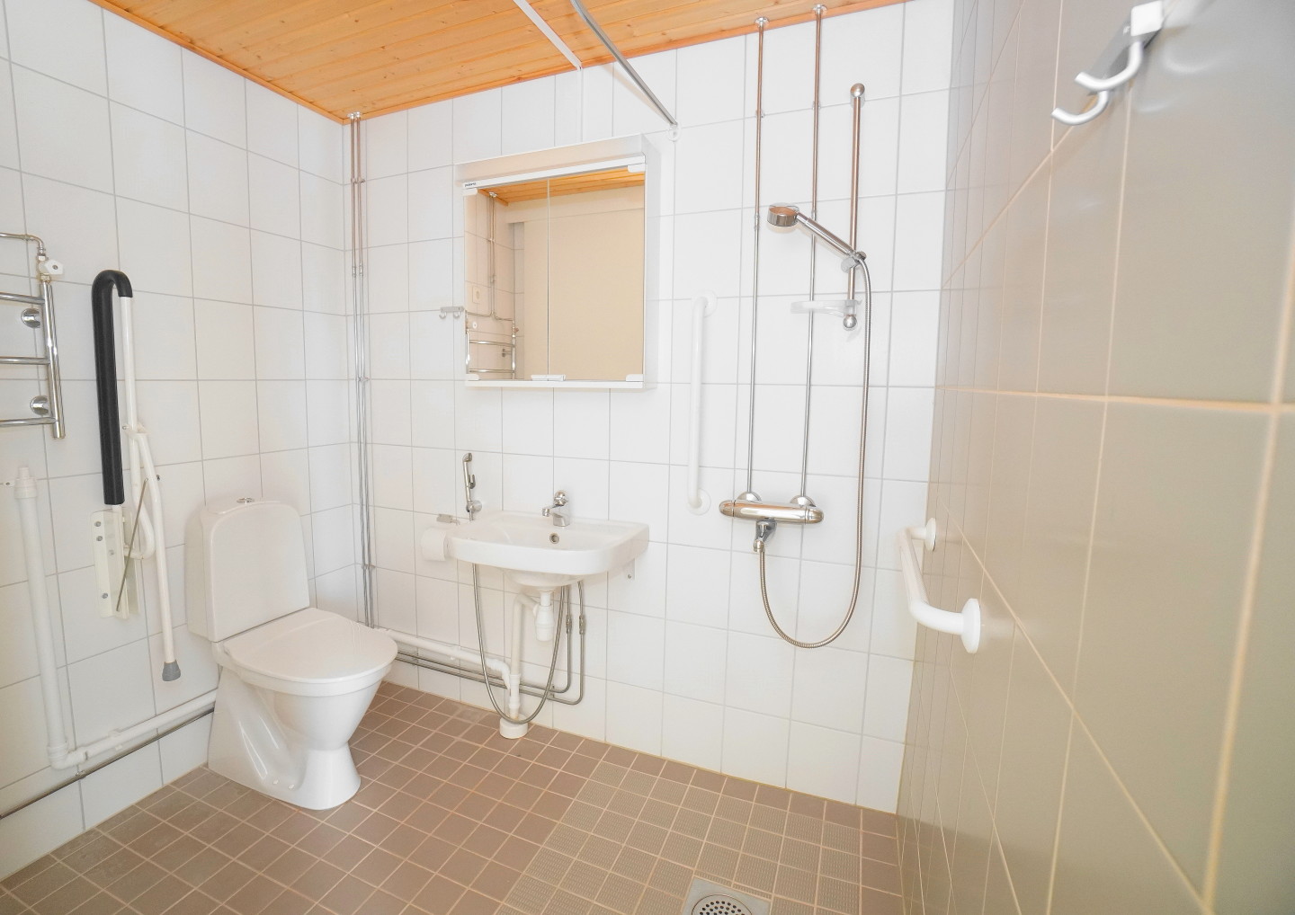 laattalattia; laattaseinä, peilikaappi, suihku, pesukonevalmius