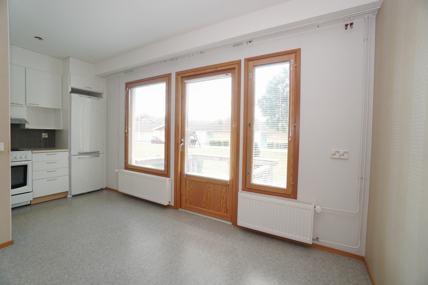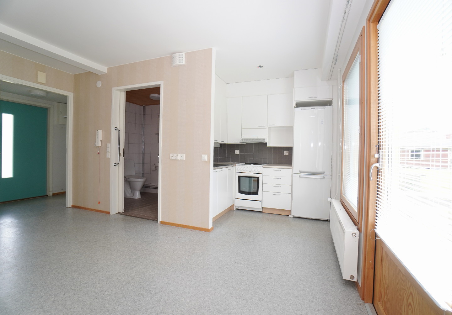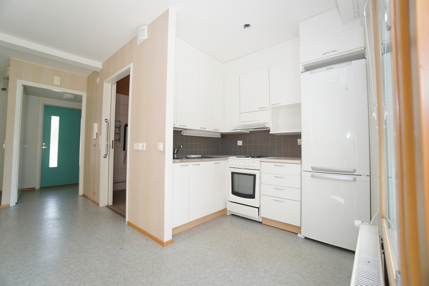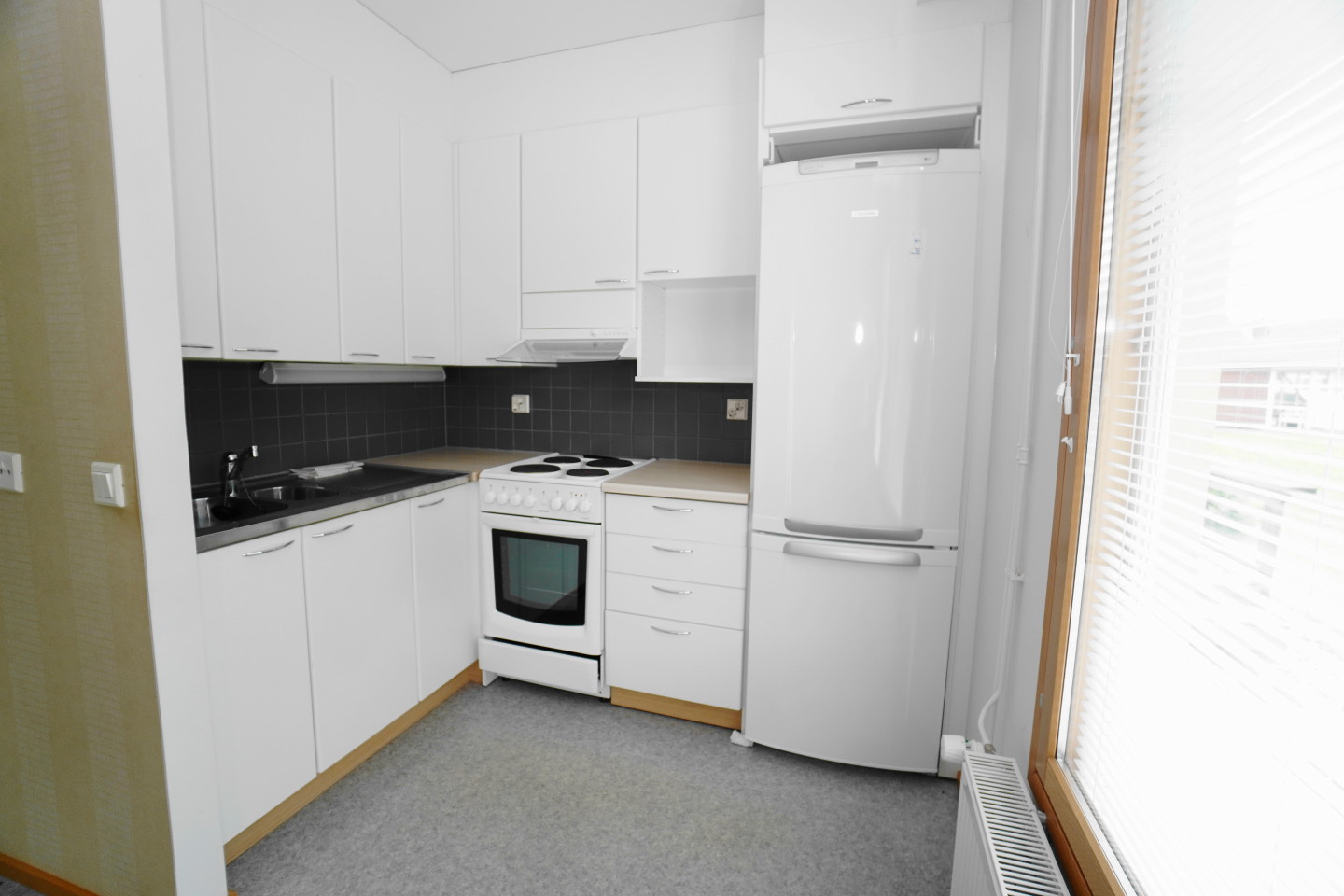 keittokomerolaminaattitasot keittiössä, sähköliesi; liesituuletin, jääkaappipakastin, paljon kaappitilaa; suuri tiskipöytä; mikrohylly