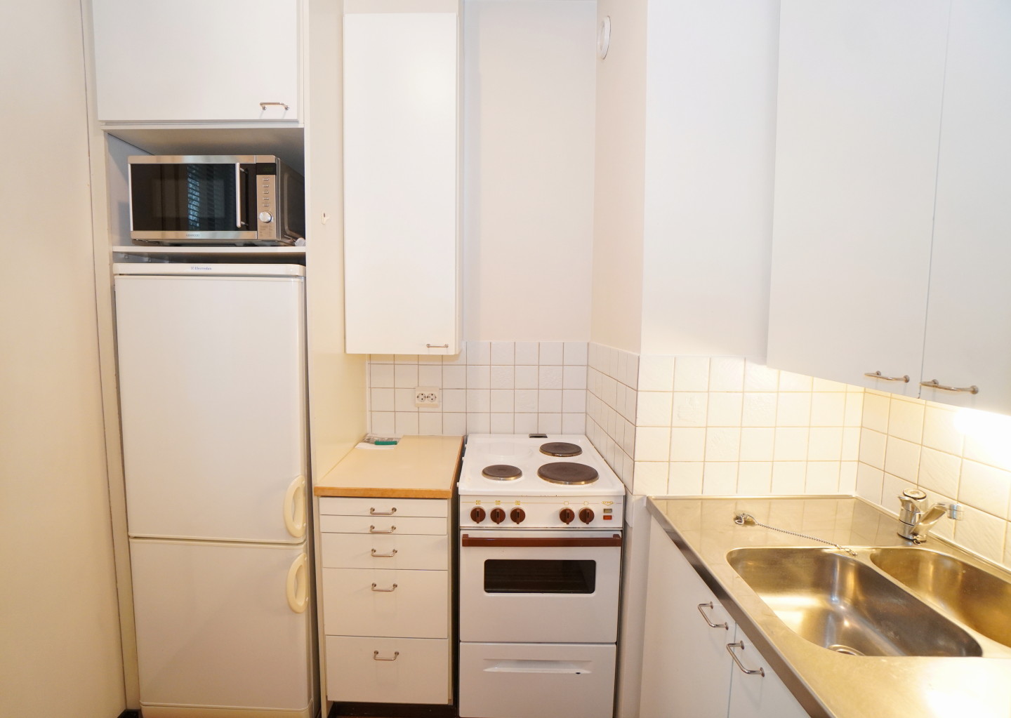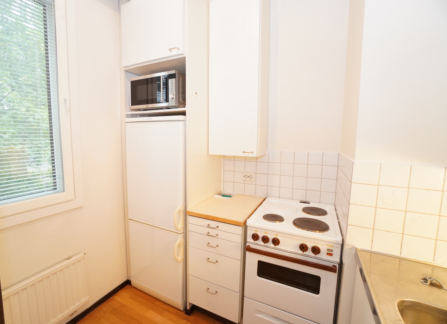 keittokomeroterästasot keittiössä; laminaattitasot keittiössä, sähköliesi, jääkaappipakastin, mikro valmiina keittiössä; mikrohylly