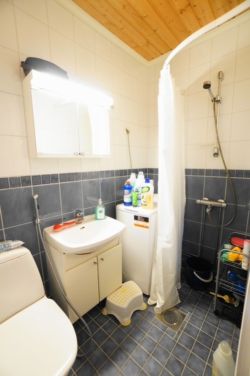 laattalattia; laattaseinä, peilikaappi, suihku, pesukonevalmius