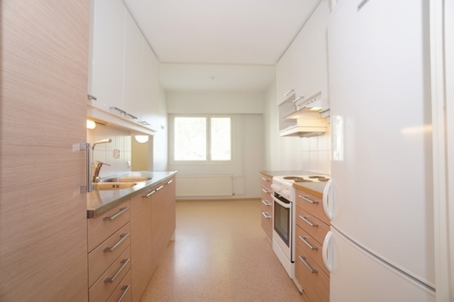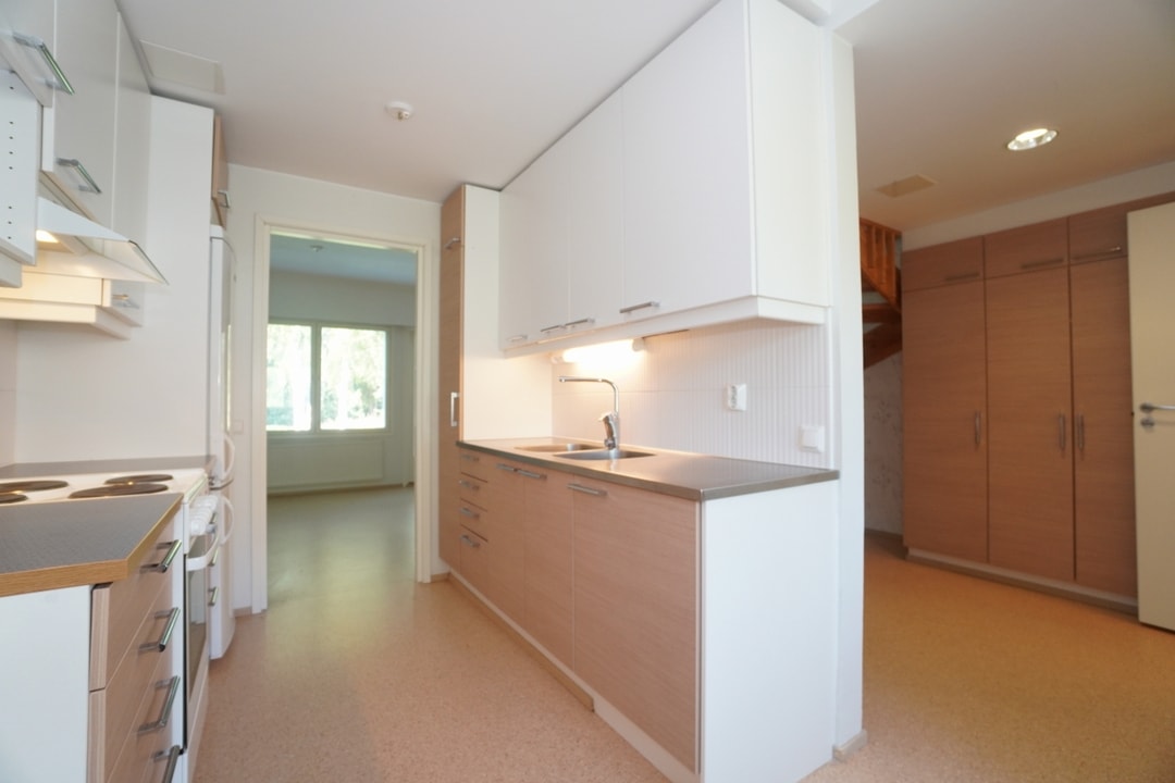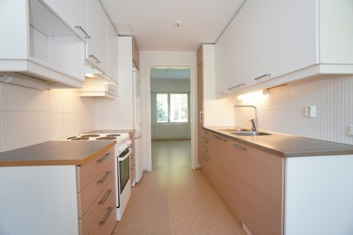 erillinen keittiö, terästasot keittiössä; laminaattitasot keittiössä, sähköliesi; liesituuletin, pesukoneliitos, jääkaappipakastin, tilaa isolle ruokapöydälle; paljon kaappitilaa; paljon työskentelytilaa; suuri tiskipöytä; mikrohylly