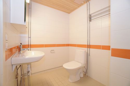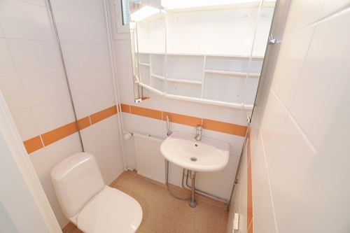 muovimatto; laattalattia; laattaseinä, myös erillinen WC, peilikaappi; muuta säilytystilaa WC:ssä, suihku, pesukonevalmius, lattialämmitys; sauna; avattava ikkuna