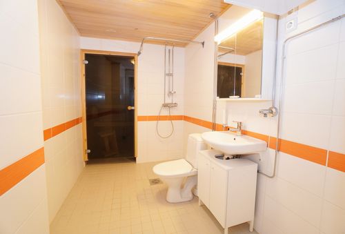 Kylpyhuone on kauttaaltaan laatoitettu ja erinomaisessa kunnossa ja pyykinpesukoneelle on liitännät. Oman saunan lämmität silloin kun sinulle sopii!