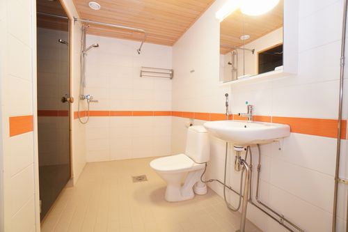 laattalattia; laattaseinä, peilikaappi; muuta säilytystilaa WC:ssä, suihku, pesukonevalmius, kylpyhuoneessa lattialämmitys; oma sauna