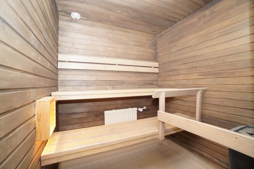 Kylpyhuone on kauttaaltaan laatoitettu ja erinomaisessa kunnossa sekä lisäksi kylpyhuoneesta löytyy oma sauna. Pyykinpesukoneelle varattu paikka, johon mahtuu pesutornikin tarvittaessa. Makuuhuoneessa on hyvin säilytystilaa ja erillinen iso vaatehuone.