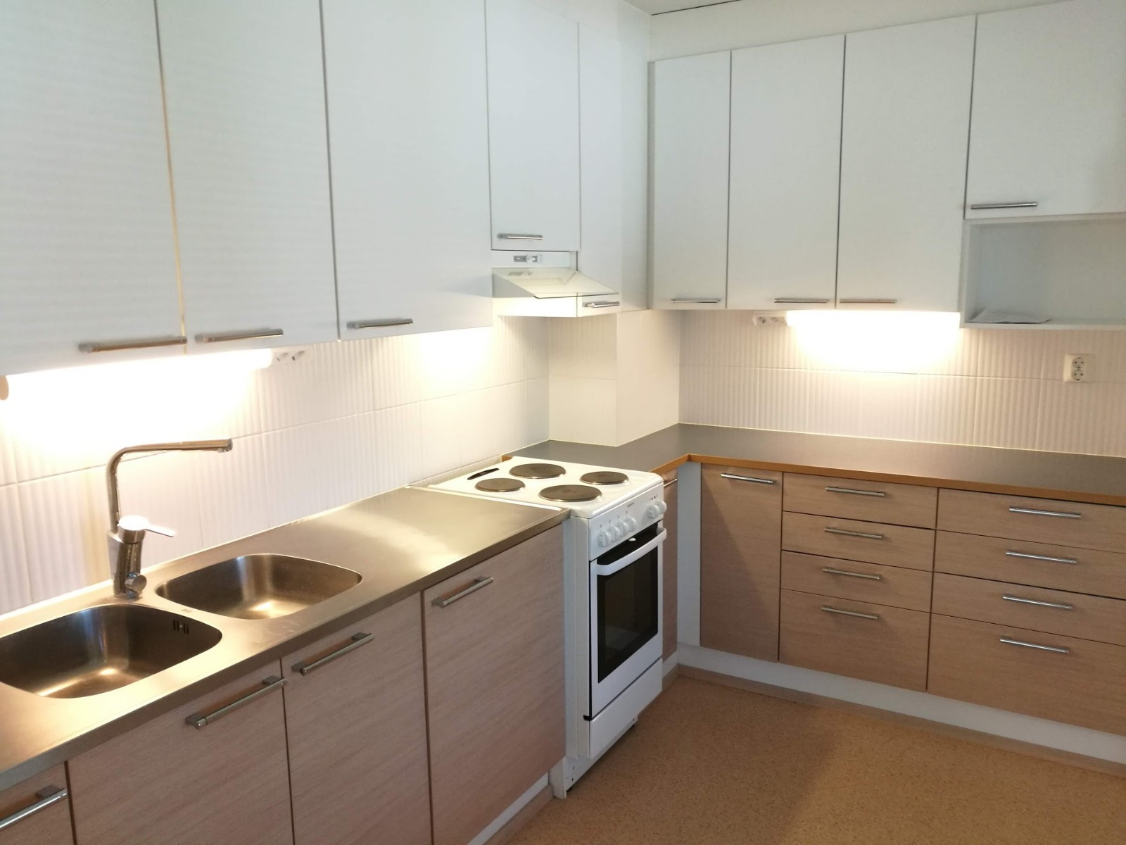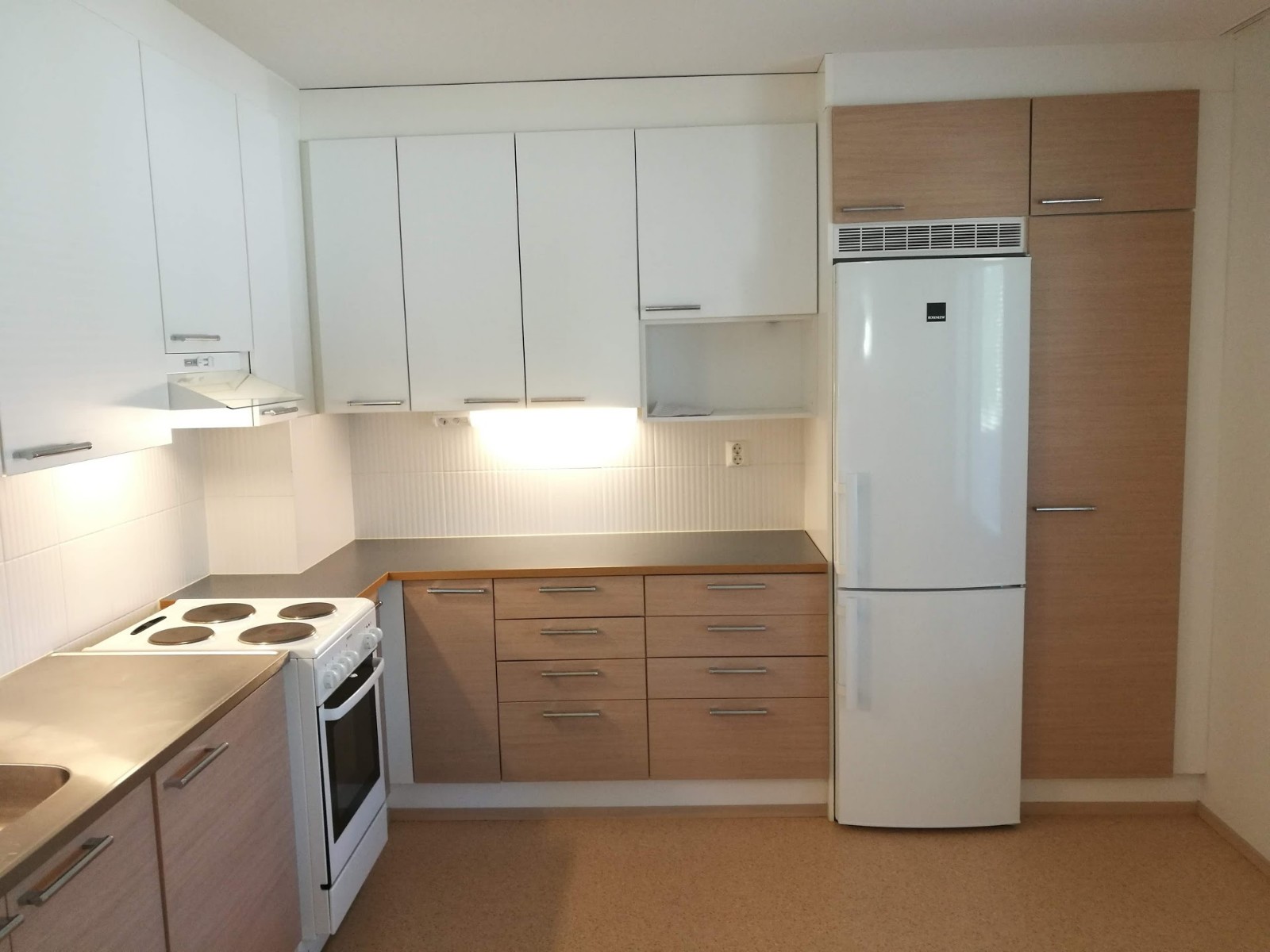 erillinen keittiöterästasot keittiössä; laminaattitasot keittiössä, sähköliesi; liesituuletin, pesukoneliitos, jääkaappipakastin, tilaa isolle ruokapöydälle; paljon kaappitilaa; paljon työskentelytilaa; suuri tiskipöytä