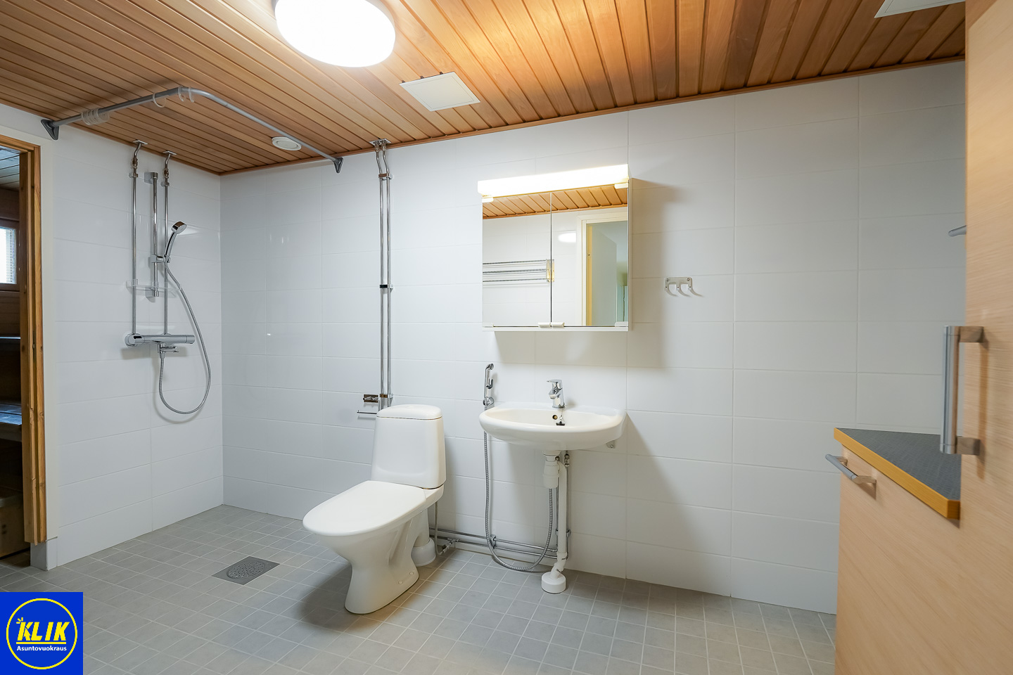 laattalattia; laattaseinä, , peilikaappi; muuta säilytystilaa WC:ssä, suihku, , pesukonevalmius, kylpyhuoneessa lattialämmitys; oma sauna