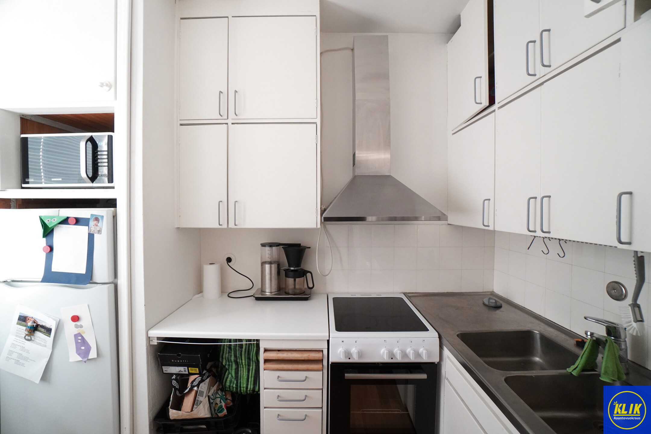 keittokomeroterästasot keittiössä; laminaattitasot keittiössä, sähköliesi; liesituuletin, , jenkkikaappi, suuri tiskipöytä; mikrohylly