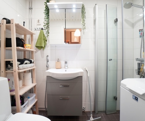 laattalattia; laattaseinä, allaskaappi; peilikaappi, suihku; suihkuseinä, pesukonevalmius; taloyhtiössä pesutupa, lattialämmitys