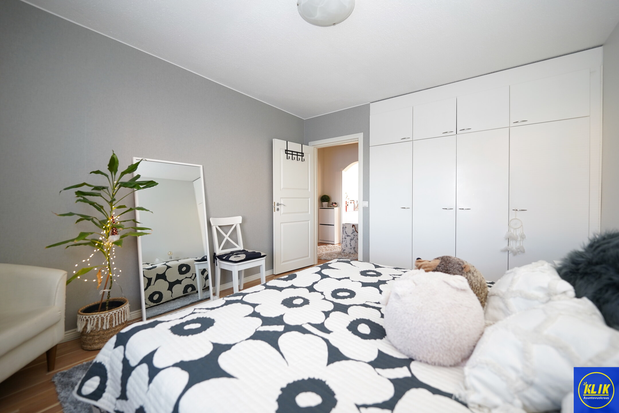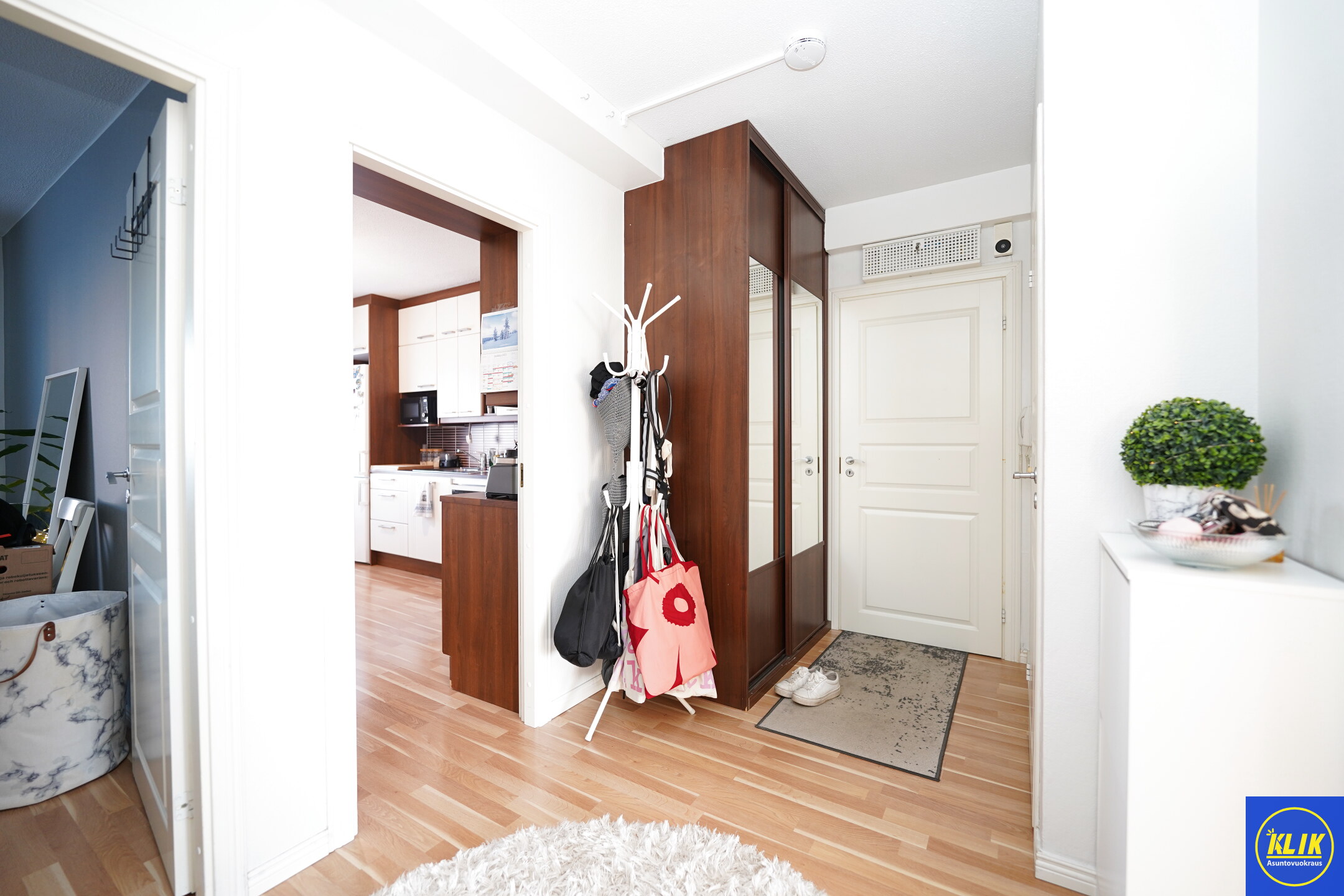 Säilytystilaa löytyy runsaasti: erillinen vaatehuone, eteisen ja makuuhuoneen vaatekomerot, sekä huoneistokohtainen varasto.