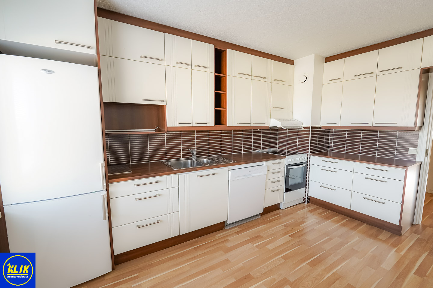erillinen keittiölaminaattitasot keittiössä, keraaminen- tai induktioliesi; liesituuletin, astianpesukone (60cm), jääkaappipakastin, tilaa isolle ruokapöydälle; paljon kaappitilaa; paljon työskentelytilaa; mikrohylly
