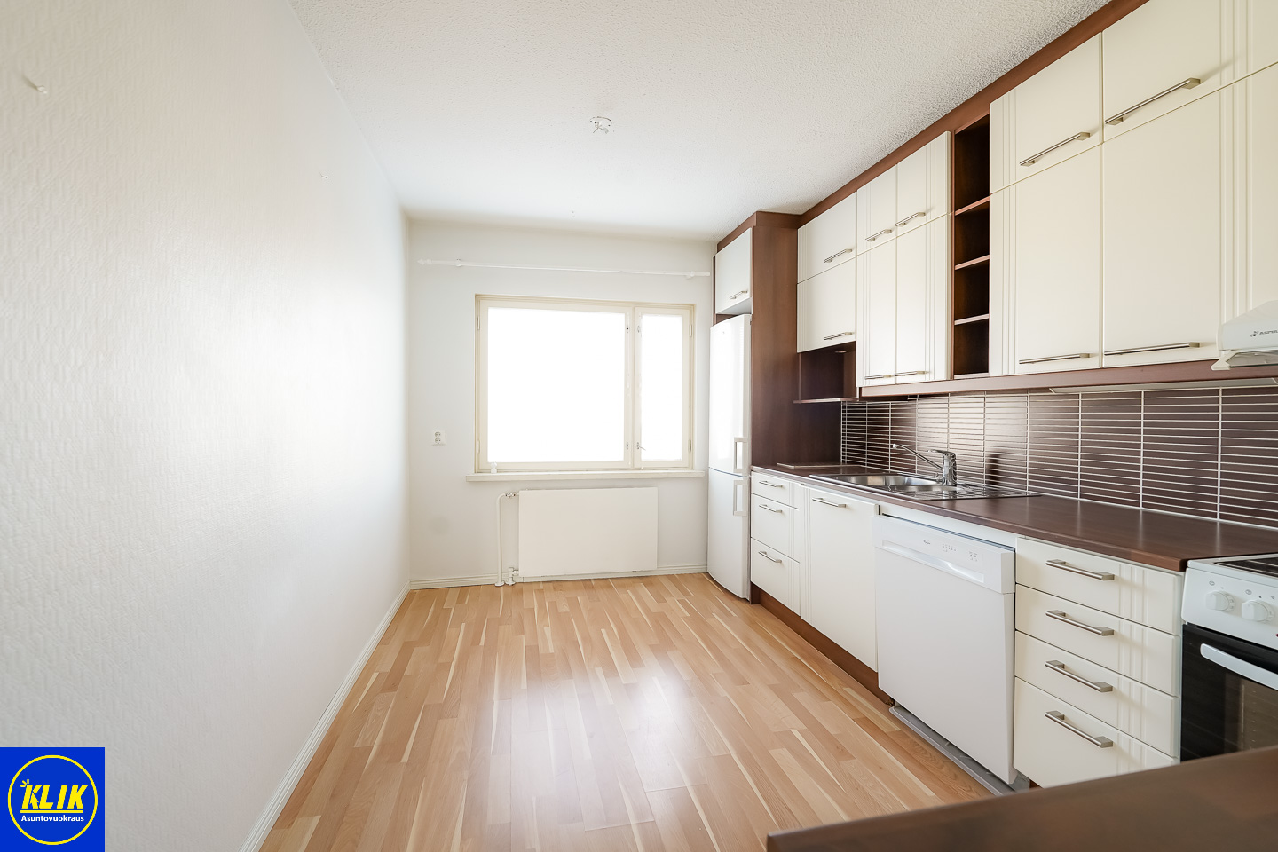 Keittiössä nykyajan vaatimusten mukaiset kodinkoneet ja rutkasti säilytystilaa!