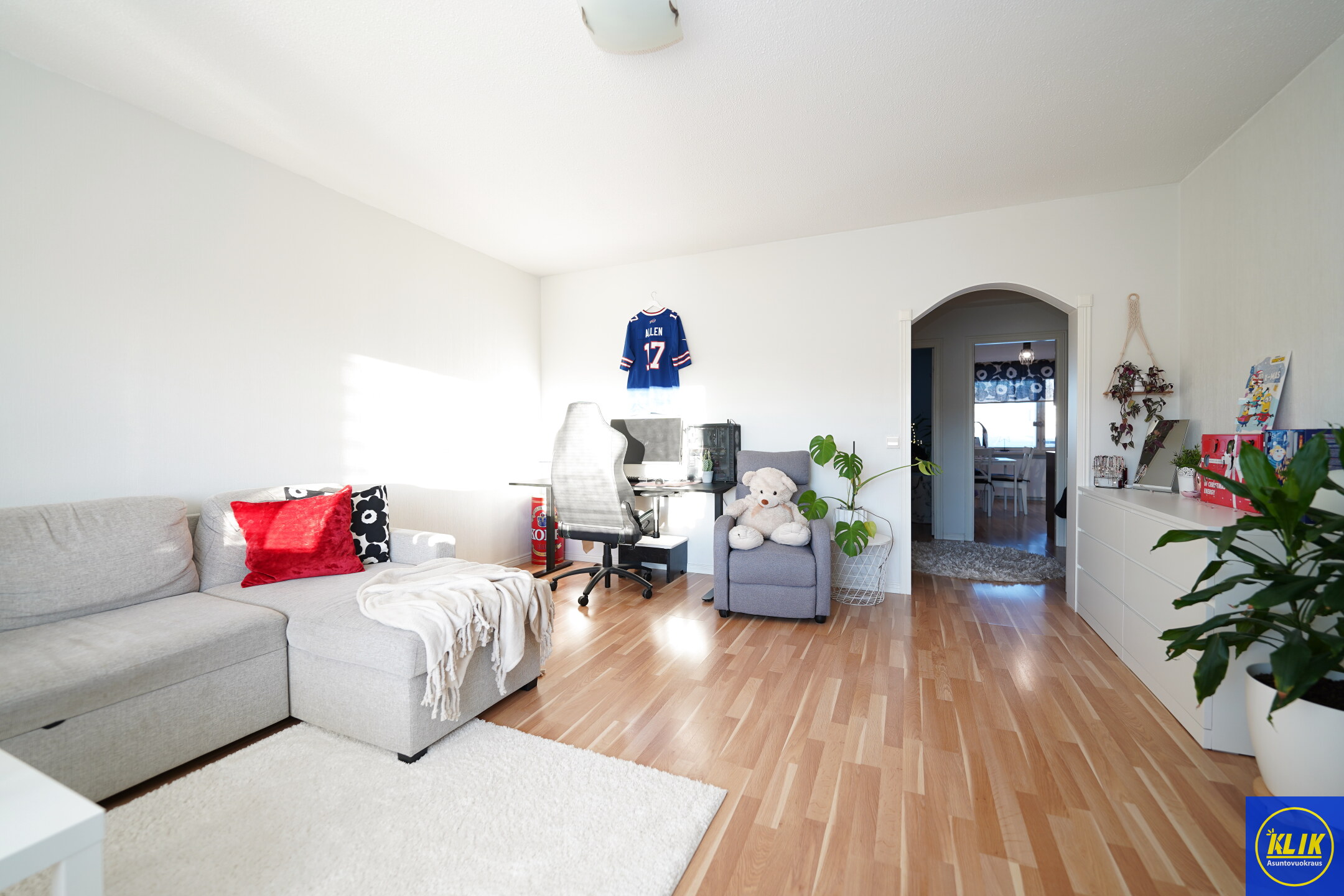 Kaikki huoneet tilavia. Olohuoneen yhteyteen sopii mainiosti vaikka iso kulmasohva ja työpiste ja muullekkin kalustukselle jää vielä hyvin tilaa.