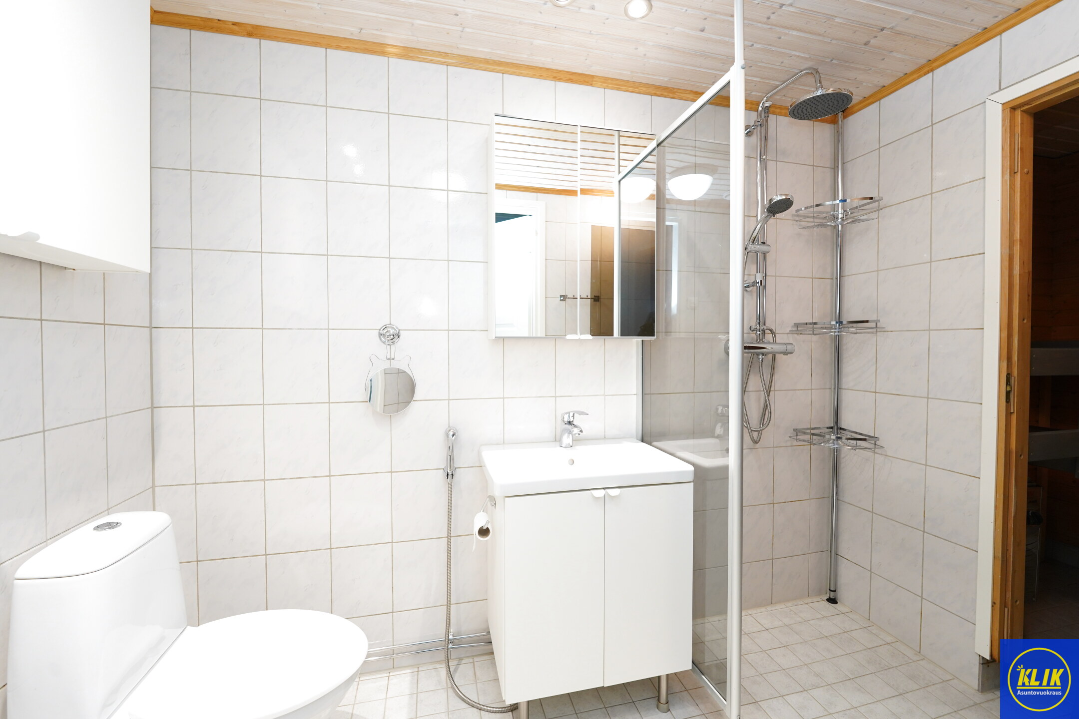 laattalattia; laattaseinä, , allaskaappi; peilikaappi; muuta säilytystilaa WC:ssä, suihku; suihkuseinä, , pesukonevalmius, oma sauna